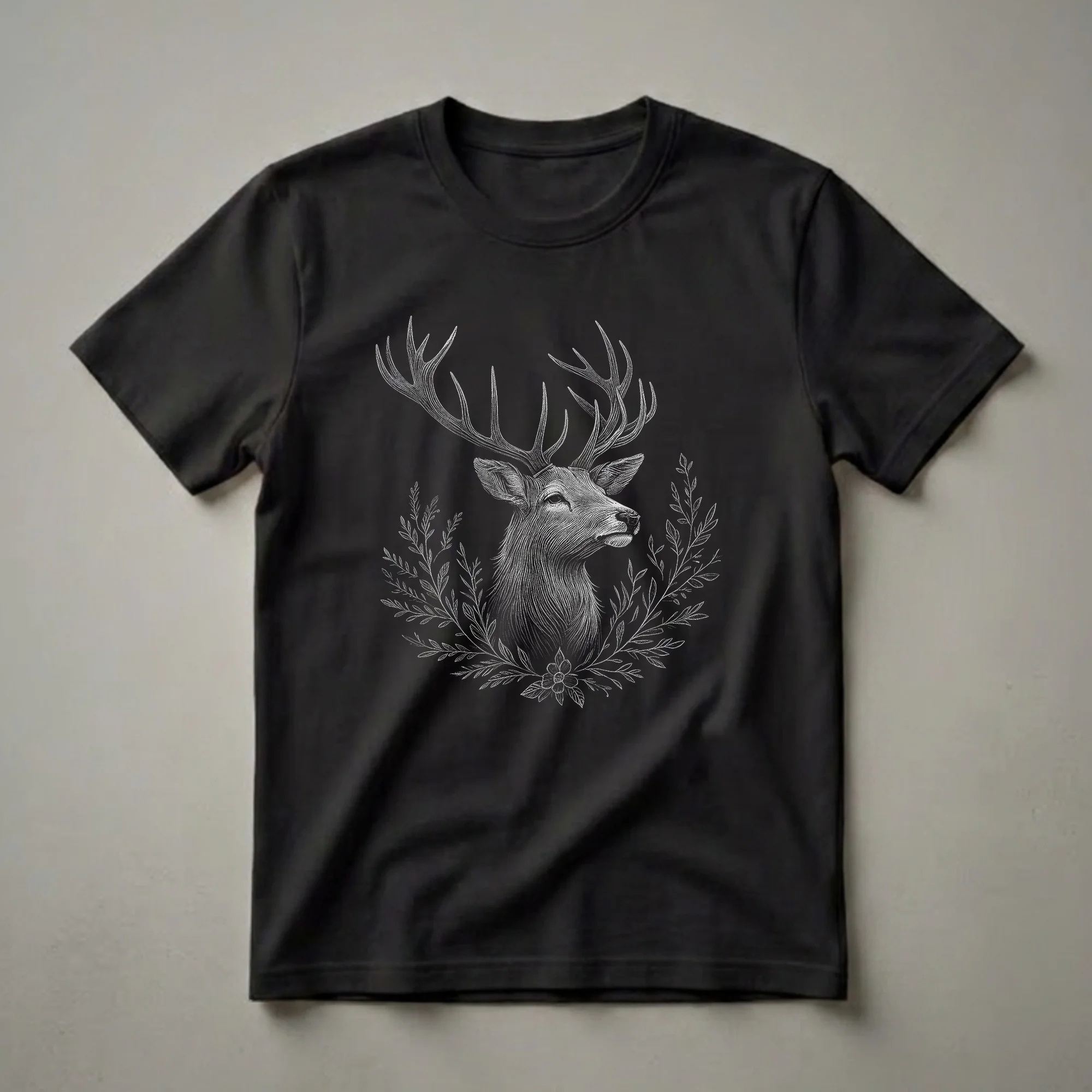 Nature enthusiasts and admirers of woodland creatures will reach for this unique graphic tee. The design features a detailed line art illustration of a stag's head, complete with impressive antlers, rendered in a striking white against a dark background. Delicate floral branches and a single bloom frame the majestic animal, adding an elegant touch to the natural motif. This shirt is a wonderful way for women who love the outdoors to express their connection to the wild. Deer, particularly stags, are symbols of grace and strength, often found in forests and meadows across North America and Europe. This tee works well for casual outings, hiking trips, or simply relaxing at home. It makes a thoughtful gift for any woman who finds beauty in the natural world, perhaps for a birthday or as a special surprise. Wear this t-shirt to celebrate your appreciation for wildlife and the serene landscapes they inhabit.