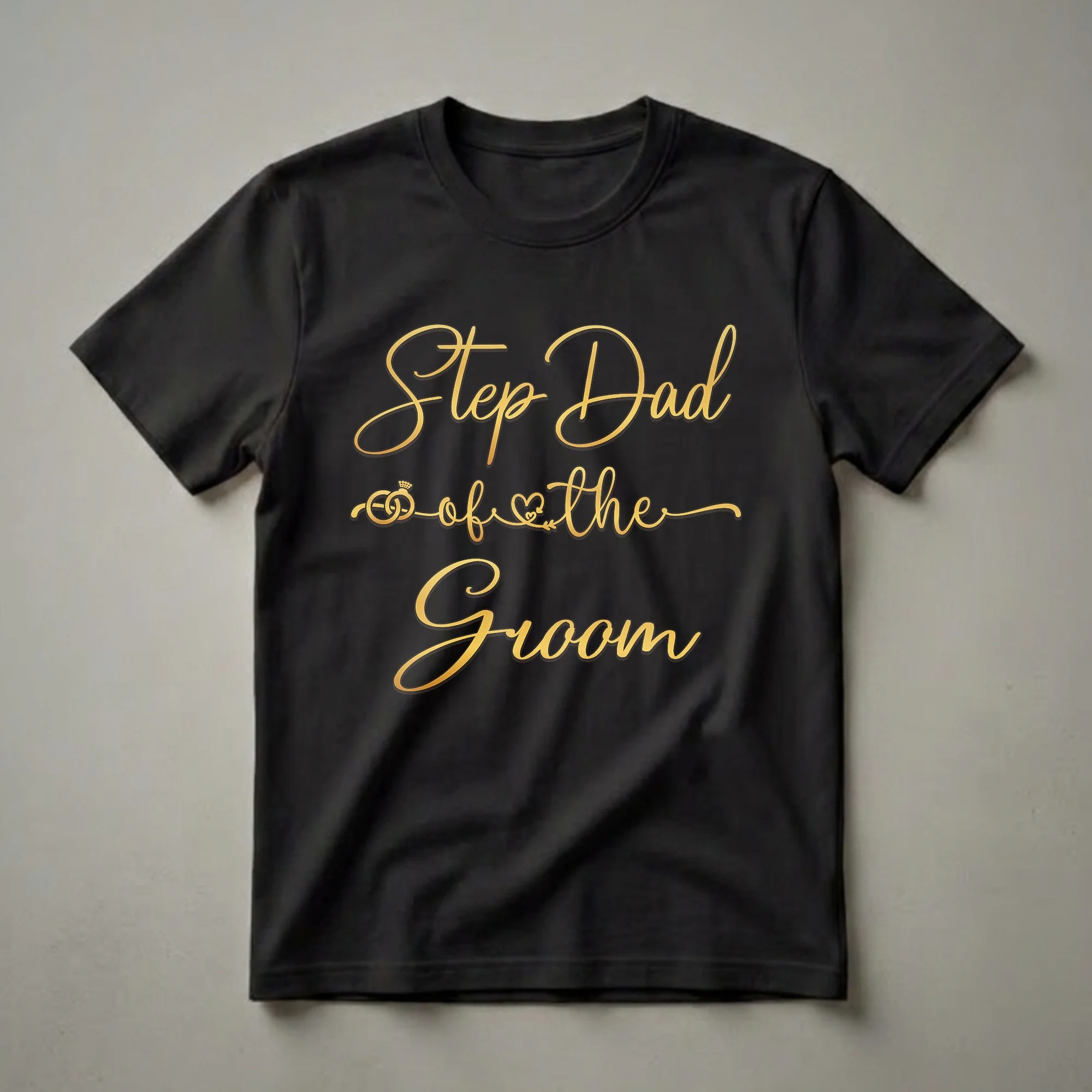 - Step Dad of the Groom t-shirt featuring elegant gold script for wedding celebrations.