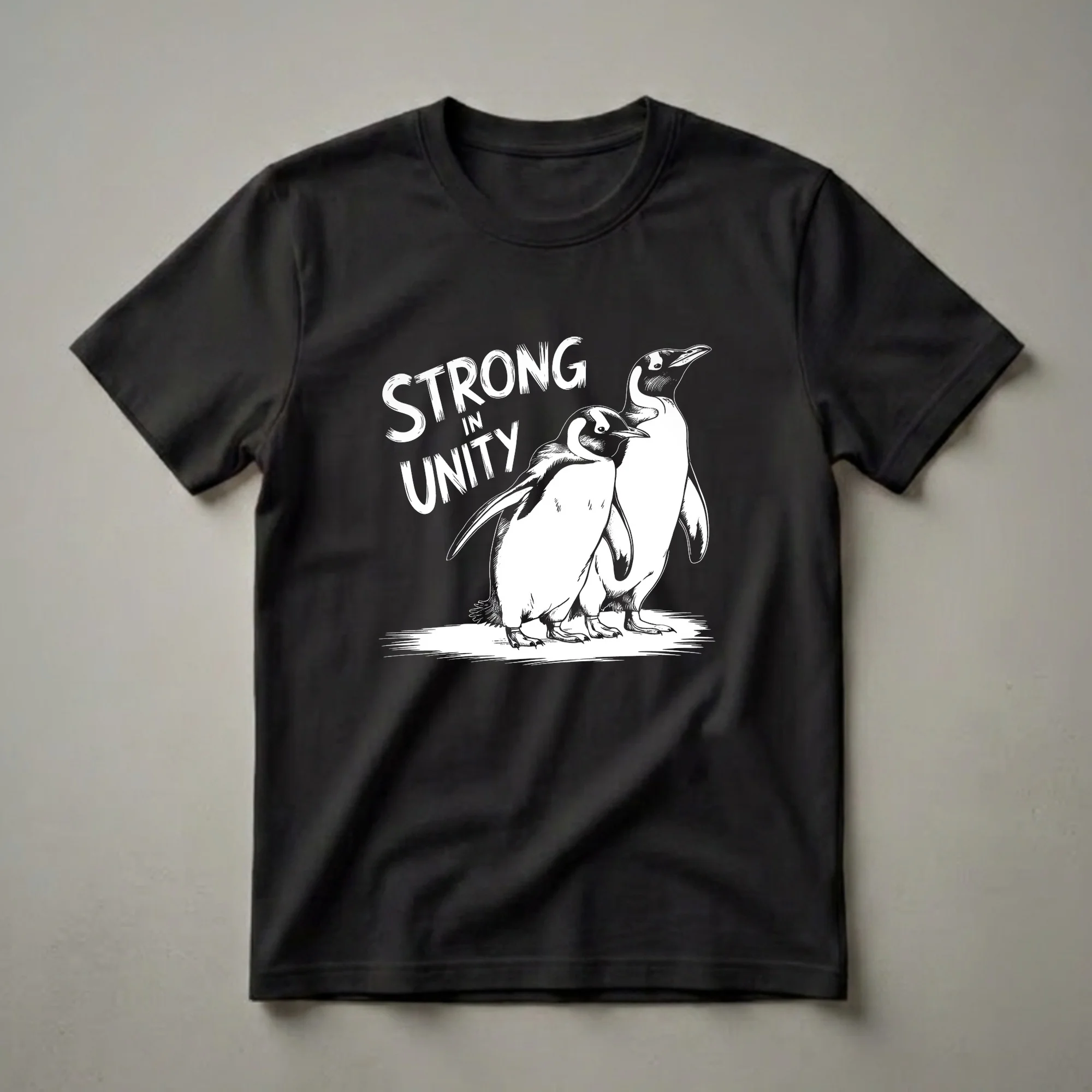 Penguins, known for their remarkable social structures and cooperative behaviors, are celebrated in this striking graphic tee. The design features two penguins standing close together, embodying the spirit of unity and loyalty. The bold, brush-stroke lettering above them reads 'STRONG IN UNITY,' reinforcing the theme of collective strength. These flightless birds, often found in the Southern Hemisphere, particularly in Antarctica, are masters of survival in harsh environments, relying on each other for warmth and protection. This shirt is a tribute to their resilience and the power of togetherness. It's a perfect piece of apparel for anyone who admires the natural world and the bonds that form within it. Whether you're a seasoned birder, a nature photographer, or simply someone who appreciates the unique charm of penguins, this t-shirt makes a thoughtful gift. Imagine wearing this eye-catching tee on your next nature walk or to a casual gathering, sparking conversations about wildlife and conservation. It's a staple for any nature lover's wardrobe, offering both style and a meaningful message.