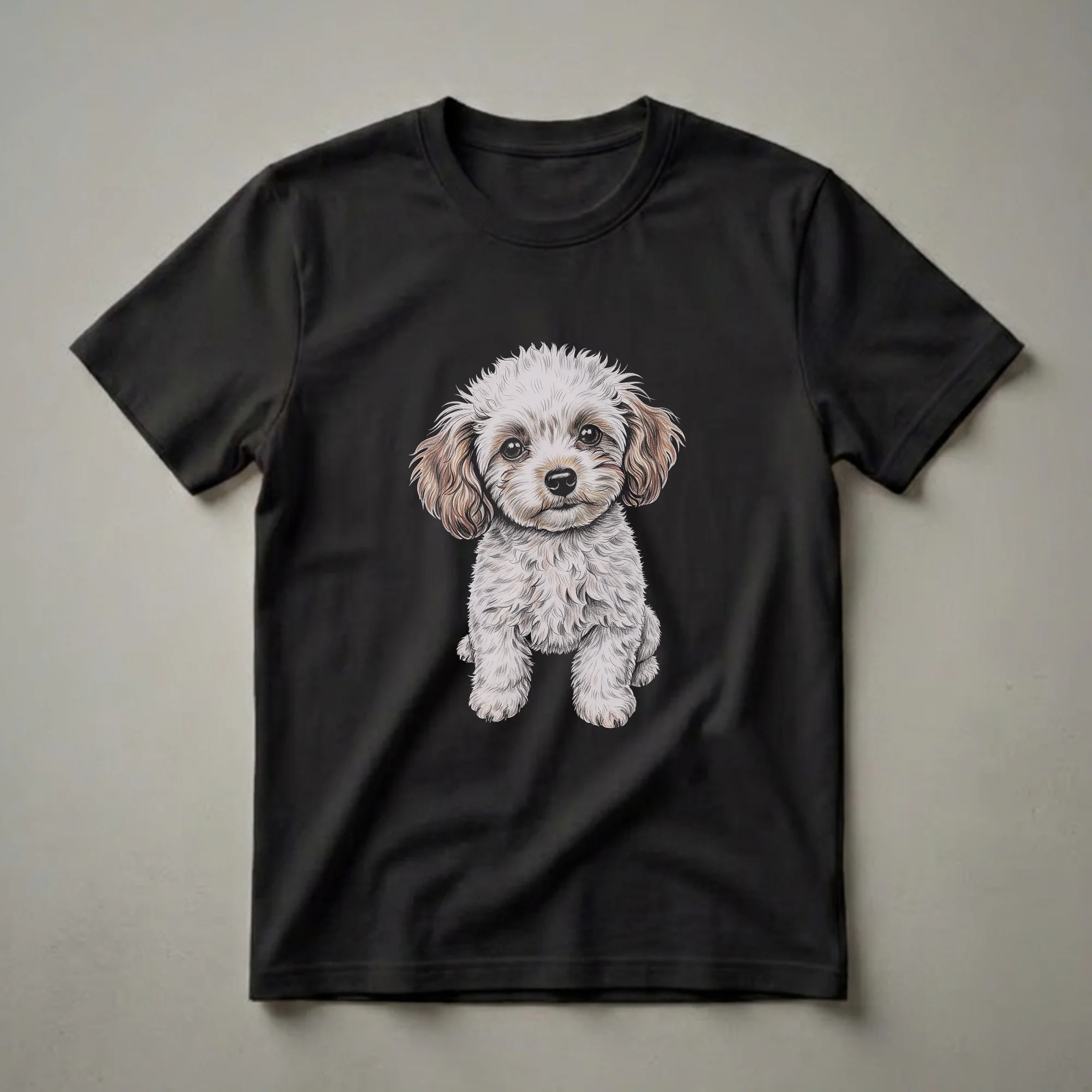 Poodle owners who adore their small, intelligent companions will appreciate this artistic t-shirt featuring a detailed drawing of a teacup poodle. The artwork captures the breed's characteristic fluffy coat and endearing expression with delicate pencil strokes, set against a stark black background that makes the pup pop. Teacup poodles, a miniature variety of the standard poodle, are known for their playful nature and hypoallergenic coats, making them popular pets for families and individuals alike. This shirt is a thoughtful gift for any dog mom, dog dad, or anyone who cherishes the unique charm of these small dogs. It's a go-to tee for casual outings, trips to the dog park, or simply relaxing at home with your furry friend. The intricate drawing style evokes a vintage wildlife illustration feel, celebrating the beauty of this beloved canine breed. Wear this tee to express your affection for your four-legged family member and spark conversations with fellow dog lovers.