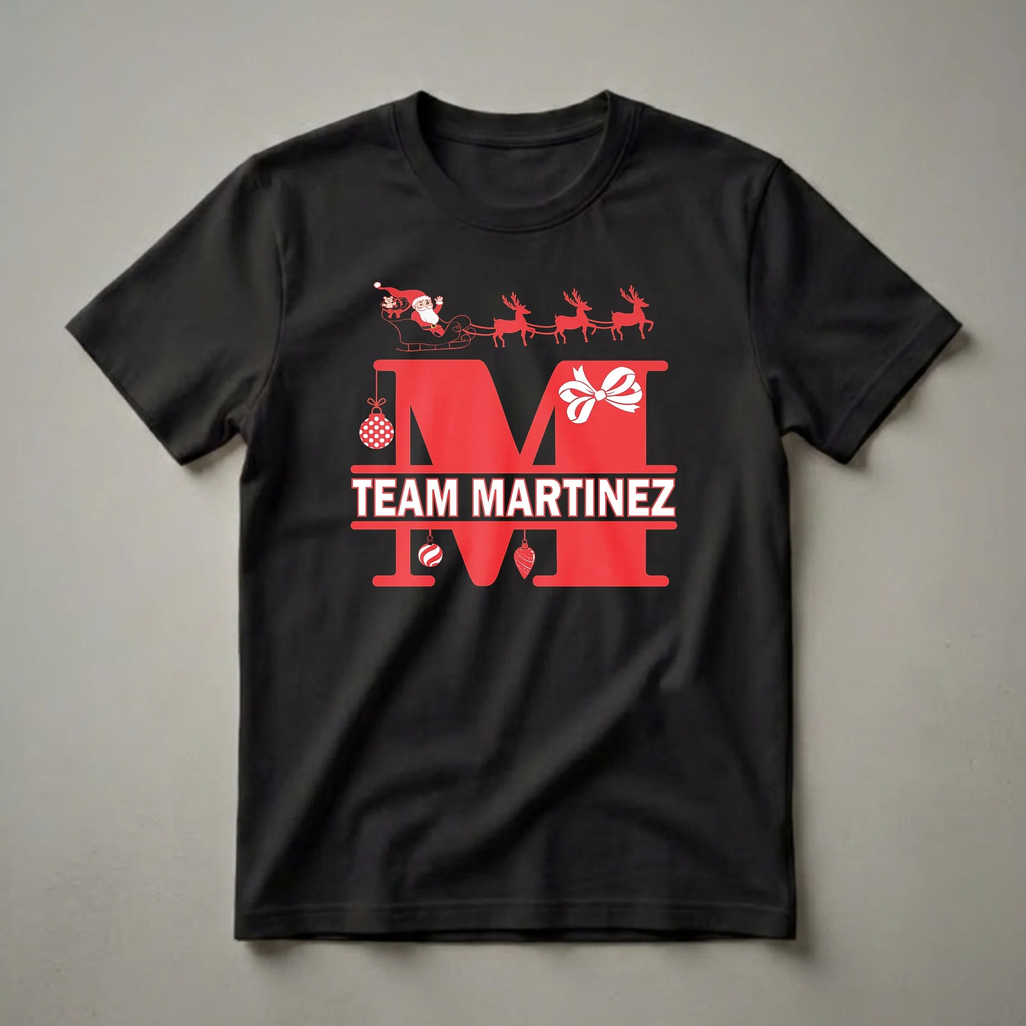 Families looking to coordinate their holiday attire will reach for this festive Team Martinez shirt. The design prominently features a large, bold red split letter 'M', symbolizing the family's surname. Across the center of the 'M', the words 'TEAM MARTINEZ' are displayed in crisp white lettering with a subtle red outline, clearly identifying the family unit. Above the split letter, Santa Claus is depicted in his sleigh, pulled by a team of four reindeer, all rendered in red. This iconic Christmas imagery evokes the magic of the holiday season. Adding to the festive spirit, the design incorporates several Christmas ornaments. A red and white polka dot bauble hangs to the left of the 'M', and a red, striped, teardrop-shaped ornament dangles from the bottom right. A white ribbon bow is also affixed to the top right of the 'M', resembling a gift wrap accent. This t-shirt is a thoughtful gift for any member of the Martinez family who wants to showcase their unity during Christmas celebrations, whether for holiday photos, family gatherings, or festive outings. It's a great way for the entire family to get into the holiday spirit together.