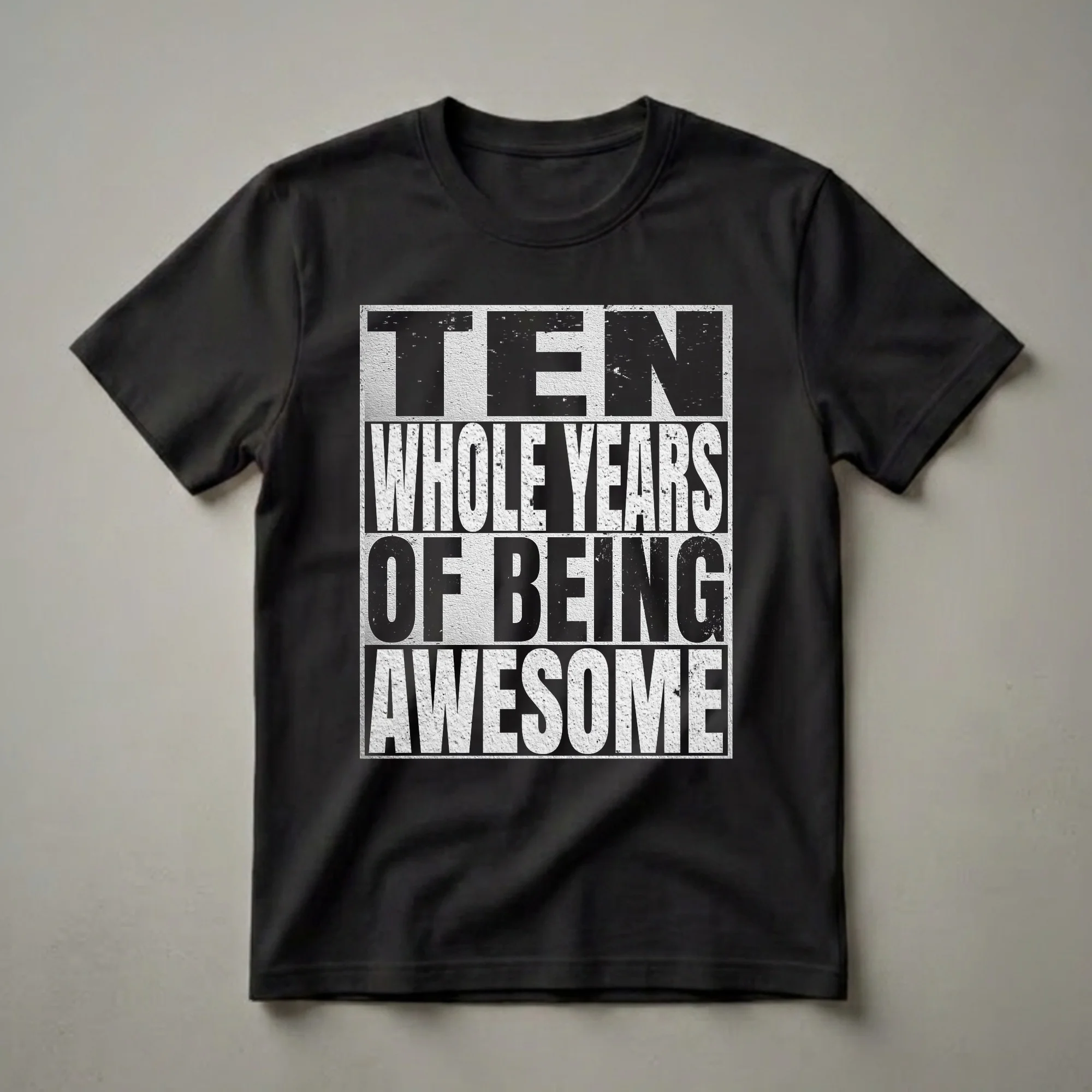 Celebrate a decade of eye-catching with this 'Ten Whole Years Of Being eye-catching' graphic t-shirt, commemorating a special 10th birthday.This graphic t-shirt proudly proclaims 'Ten Whole Years Of Being eye-catching,' celebrating this special birthday. The bold, distressed black and white lettering stands out, making it a striking piece of apparel for any ten-year-old. This tee is a fantastic way for a child to express their excitement about reaching double digits. It's a staple in any birthday collection, a thoughtful gift for wearing to a birthday party, school, or just for everyday fun. This shirt makes a thoughtful gift for any child celebrating their tenth birthday, offering a fun and memorable way to commemorate the occasion. It's a go-to tee that they'll reach for again and again as they embrace their new age.