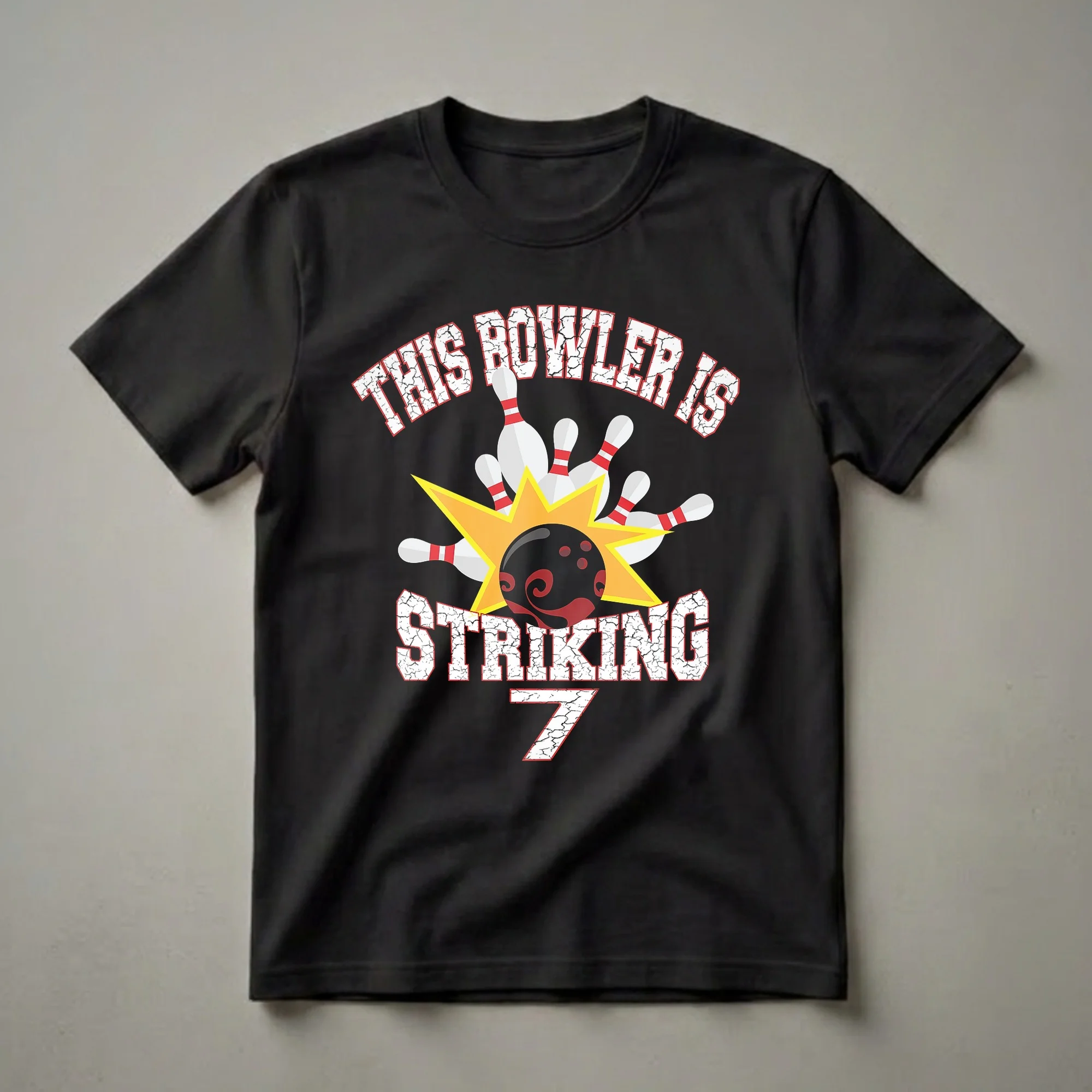 Seven-year-old birthday boys who are hitting their stride will love this "This Bowler Is Striking" graphic tee. The design features a black bowling ball with red swirls, impacting a cluster of white bowling pins with red stripes. A bright yellow starburst graphic emanates from the impact zone, adding a dynamic visual element. The words "THIS BOWLER IS" are displayed in distressed white block letters with a red outline across the top, while "STRIKING" appears in similar lettering below the bowling action. The number "7" is prominently featured at the bottom, also in distressed white with a red outline, clearly marking the milestone birthday. This shirt is a fantastic way for a young bowler to show off their age and their passion for the sport. It's a thoughtful gift for any child turning seven who enjoys bowling parties or family outings to the alley. Imagine their excitement wearing this eye-catching tee to their birthday celebration or their next bowling adventure. This t-shirt is a fun statement piece for any seven-year-old who aims for strikes and spares.