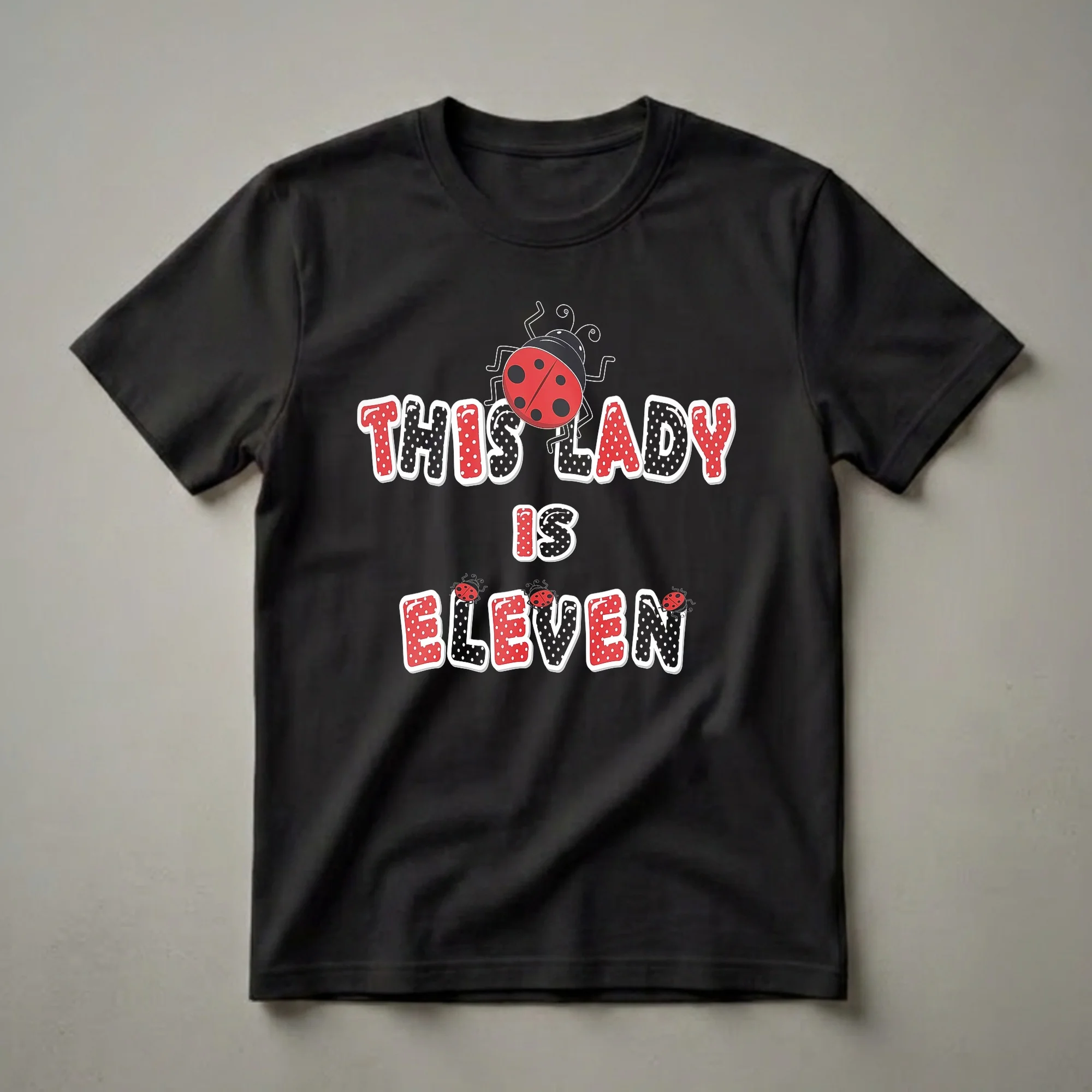 Eleven years old is a significant milestone, marking a transition into the pre-teen years. This "This Lady Is Eleven" birthday shirt captures that excitement with a playful design. The graphic features bold, bubbly lettering in alternating red and black polka dots, outlined in white and with a subtle shadow effect. A charming ladybug illustration sits atop the word "LADY," and smaller ladybugs are scattered around the word "ELEVEN," adding a whimsical touch. Ladybugs, often seen as symbols of good luck, are a delightful motif for a birthday celebration. This tee is a thoughtful gift for any girl turning eleven who loves cute insects or simply wants a fun, eye-catching shirt for her special day. It's a go-to tee for birthday parties, family gatherings, or just everyday wear, making her feel celebrated and stylish as she enters her eleventh year. The vibrant red and black color scheme, combined with the playful polka dots, makes this shirt stand out. This shirt works well for an eleven-year-old girl to express her personality and mark this important birthday.