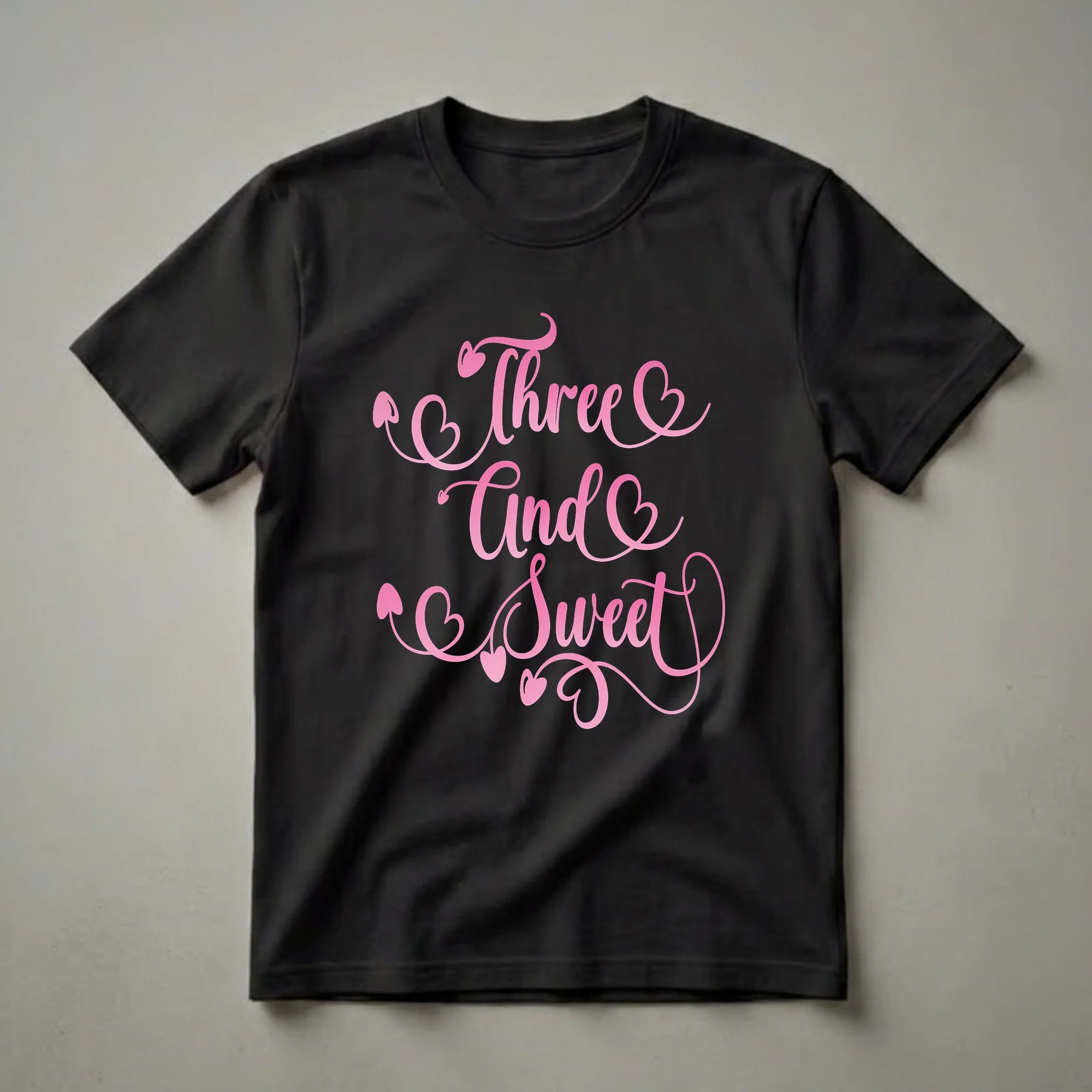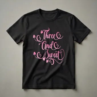 Three-year-old girls are entering a vibrant stage of discovery and personality. This 'Three and Sweet' graphic tee captures that joyful spirit with its playful pink script and charming heart accents. The text, rendered in a gradient pink, flows elegantly across the design, making it eye-catching for any little one celebrating a milestone birthday. The number 'three' is prominently featured, surrounded by decorative swirls and small hearts, adding a touch of sweetness that toddlers adore. This t-shirt is a wonderful way for a three-year-old girl to express her age and personality on her special day. It’s a thoughtful gift for parents or grandparents looking for a unique present for a child turning three. Imagine her wearing this shirt to her birthday party, a family gathering, or even just for a fun day out, feeling celebrated and special. This shirt is a staple for any toddler's birthday wardrobe, offering comfort and style for the birthday girl. It's a sweet reminder of a cherished milestone, made for creating lasting memories.