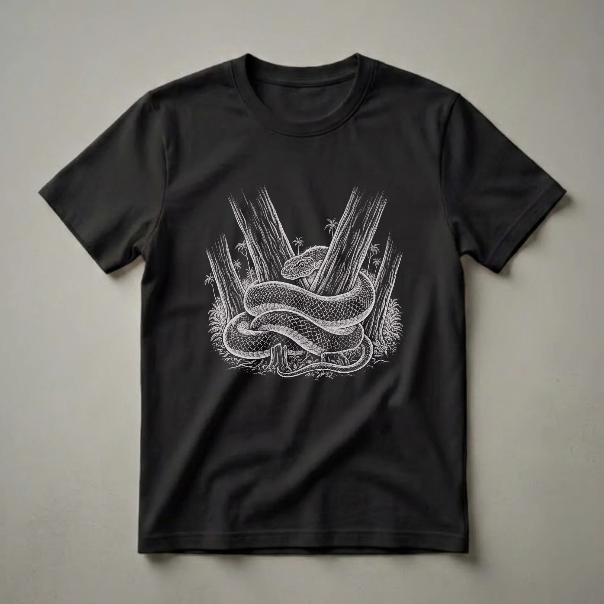 Reptile enthusiasts and paleontology fans will appreciate this striking graphic tee featuring a detailed drawing of the Titanoboa, the largest snake known to have ever existed. This prehistoric serpent is depicted coiled around thick tree trunks amidst lush tropical foliage and palm trees, rendered in a vintage, monochromatic style. The Titanoboa, which lived approximately 60 to 58 million years ago during the Paleocene Epoch, inhabited the tropical rainforests of what is now Colombia. Its immense size, estimated to be up to 42 feet long and weigh over 2,500 pounds, made it one of the largest and most formidable predators of its time. This unique t-shirt serves as a conversation starter, worn to nature exhibits, hiking trails, or casual outings. It makes a thoughtful gift for anyone fascinated by ancient reptiles, natural history, or the incredible diversity of life on Earth. Add this eye-catching piece of apparel to your collection and wear your passion for the ancient world.