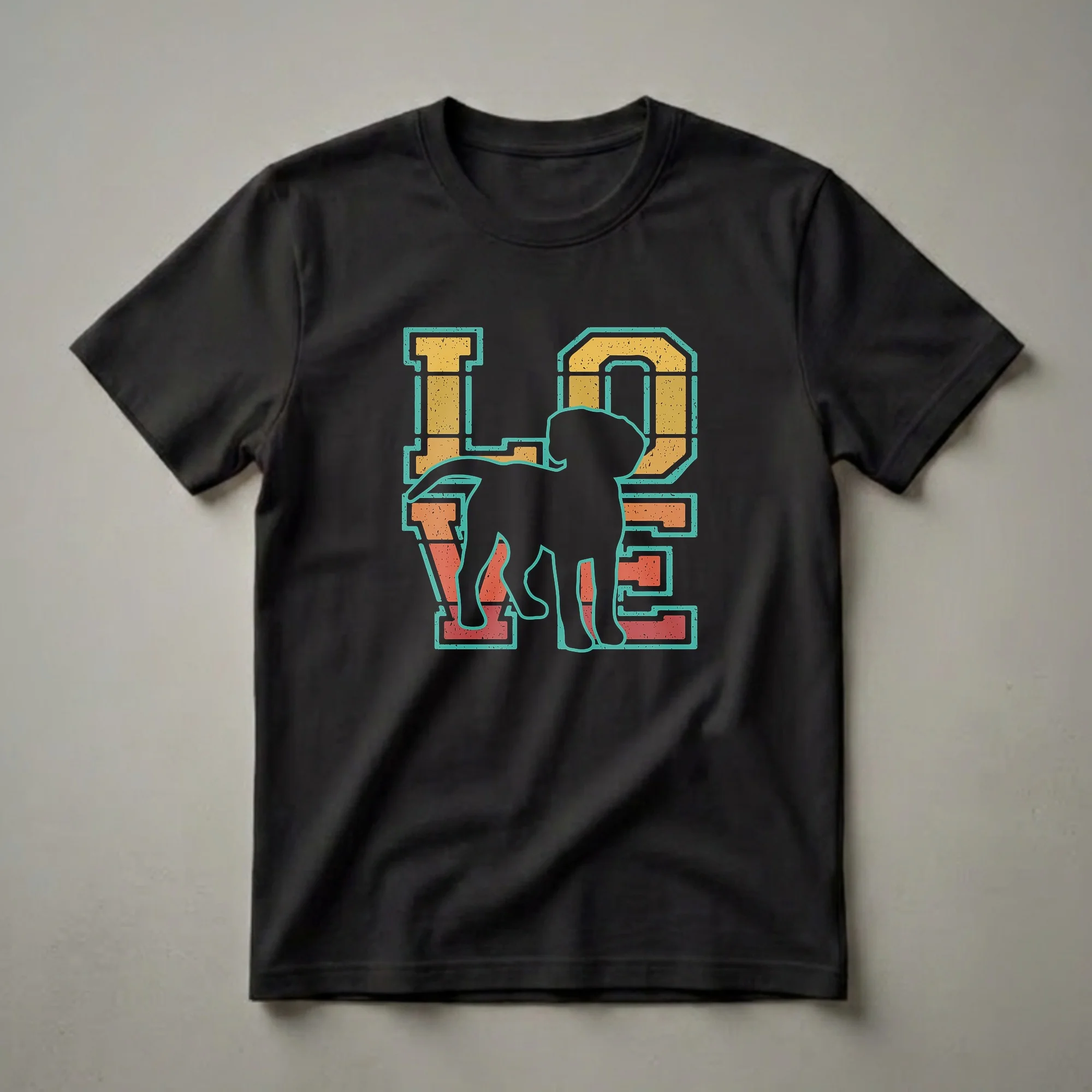 Treeing Walker Coonhound owners who appreciate vintage aesthetics will reach for this eye-catching graphic tee. The design features the word 'LOVE' in a bold, retro font, filled with a distressed sunset color gradient of orange, yellow, and teal. Centered within the 'O' of 'LOVE' is the distinct silhouette of a Treeing Walker Coonhound, capturing the breed's characteristic stance. These hounds are known for their distinctive baying vocalizations and their role in hunting raccoons and other game. This shirt makes a thoughtful gift for any dog mom or dad who cherishes their Treeing Walker Coonhound. Wear this comfortable t-shirt to casual outings, dog park visits, or while relaxing at home with your beloved pet. It's a staple in the collection for any devoted dog enthusiast.