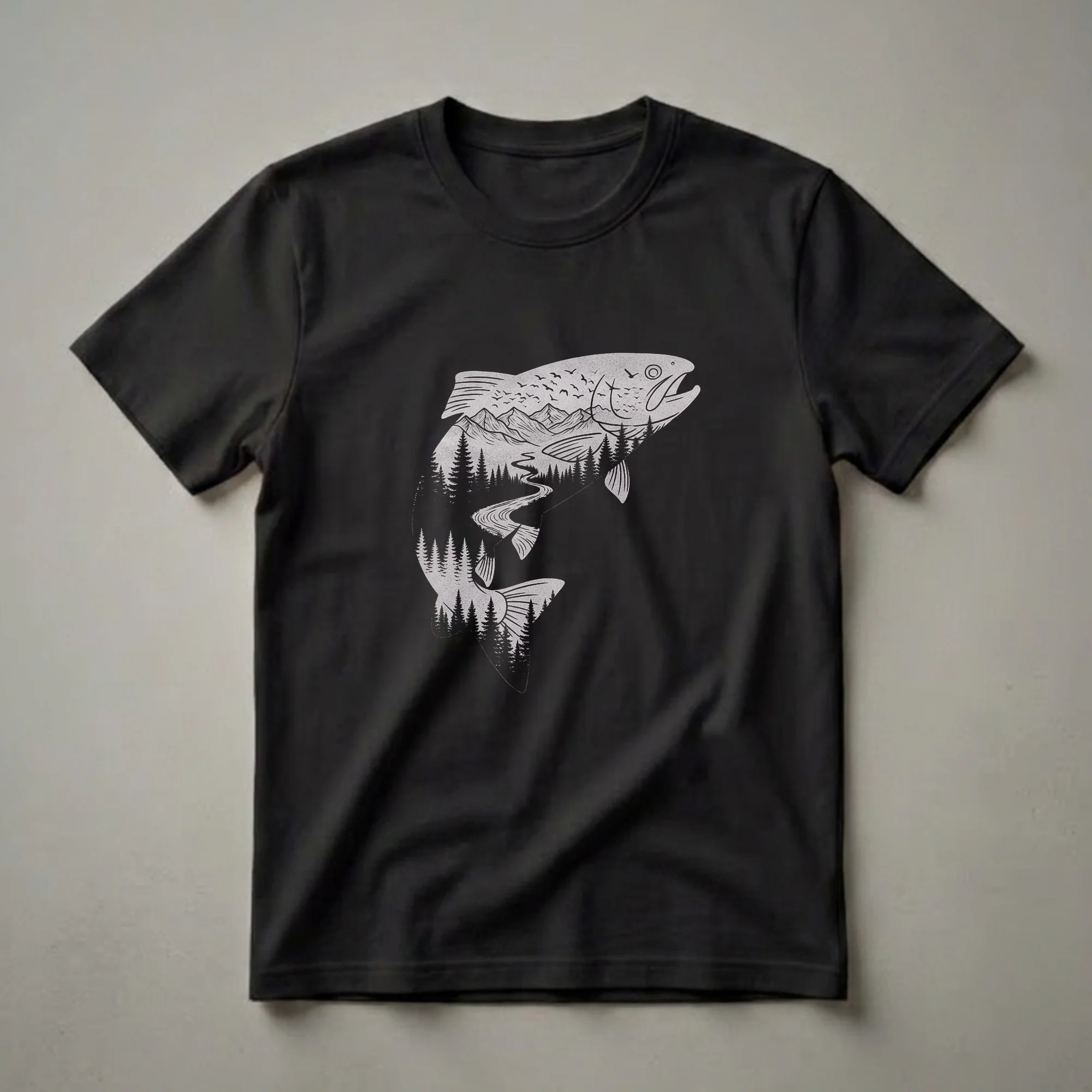 Anglers and outdoor enthusiasts will appreciate the intricate detail within this striking graphic tee. The design features a leaping trout, its silhouette filled with a serene mountain range, a winding river, and a dense forest of pine trees. Flocks of birds soar across the sky above the peaks, adding a dynamic element to the natural panorama. This shirt is a tribute to the wild places where trout thrive, from the rushing rivers to the tranquil forests. Trout, such as the rainbow trout depicted, are known for their vibrant colors and their habitat in clear, cold freshwater streams and rivers across North America and Europe. This t-shirt works well for anyone who enjoys fly fishing, hiking, or simply cherishing the beauty of the wilderness. It makes a thoughtful gift for the fisherman in your life or for someone who finds peace in nature's embrace. Wear this tee on your next fishing trip, to a casual outdoor gathering, or simply as a daily reminder of your connection to the natural world.