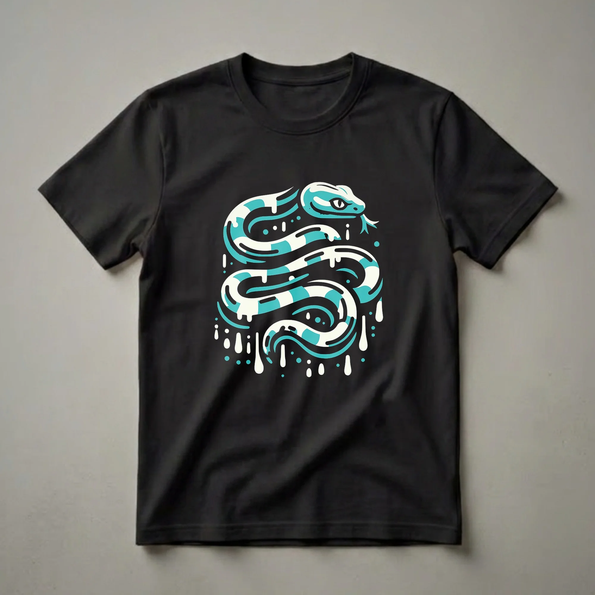 Snake enthusiasts and reptile fans who love bold, graphic art will reach for this striking tee. The design features a coiled snake with its head raised and alert, rendered in alternating bands of deep turquoise and creamy white. The snake's eye is clearly visible, giving the portrait a sense of direct, focused energy. White paint drip effects are scattered around the composition, above, below, and to the sides, adding a street-art dynamism to the artwork. The entire graphic sits against a solid black background, making the turquoise and white tones stand out with vivid clarity. Snakes are reptiles of the suborder Serpentes, found on every continent except Antarctica, and they occupy an extraordinary range of habitats from deserts and grasslands to tropical rainforests and ocean coastlines. The milk snake (Lampropeltis triangulum) and the kingsnake family are well-known examples of species that display alternating banded patterns similar to the design shown here, though king cobras, pythons, and boas are among the most commonly kept snakes in the reptile-keeping hobby. Snake keepers, herpetology students, and wildlife enthusiasts who have always been drawn to the graceful, sinuous movement of serpents will immediately connect with this tee. It makes a thoughtful gift for the snake mom or snake dad, the biology teacher with a classroom reptile, or any friend who keeps snakes and proudly identifies as a herper. Wear this shirt to a reptile expo, a casual outing, or any nature event where you want your appreciation for snakes to be unmistakable.