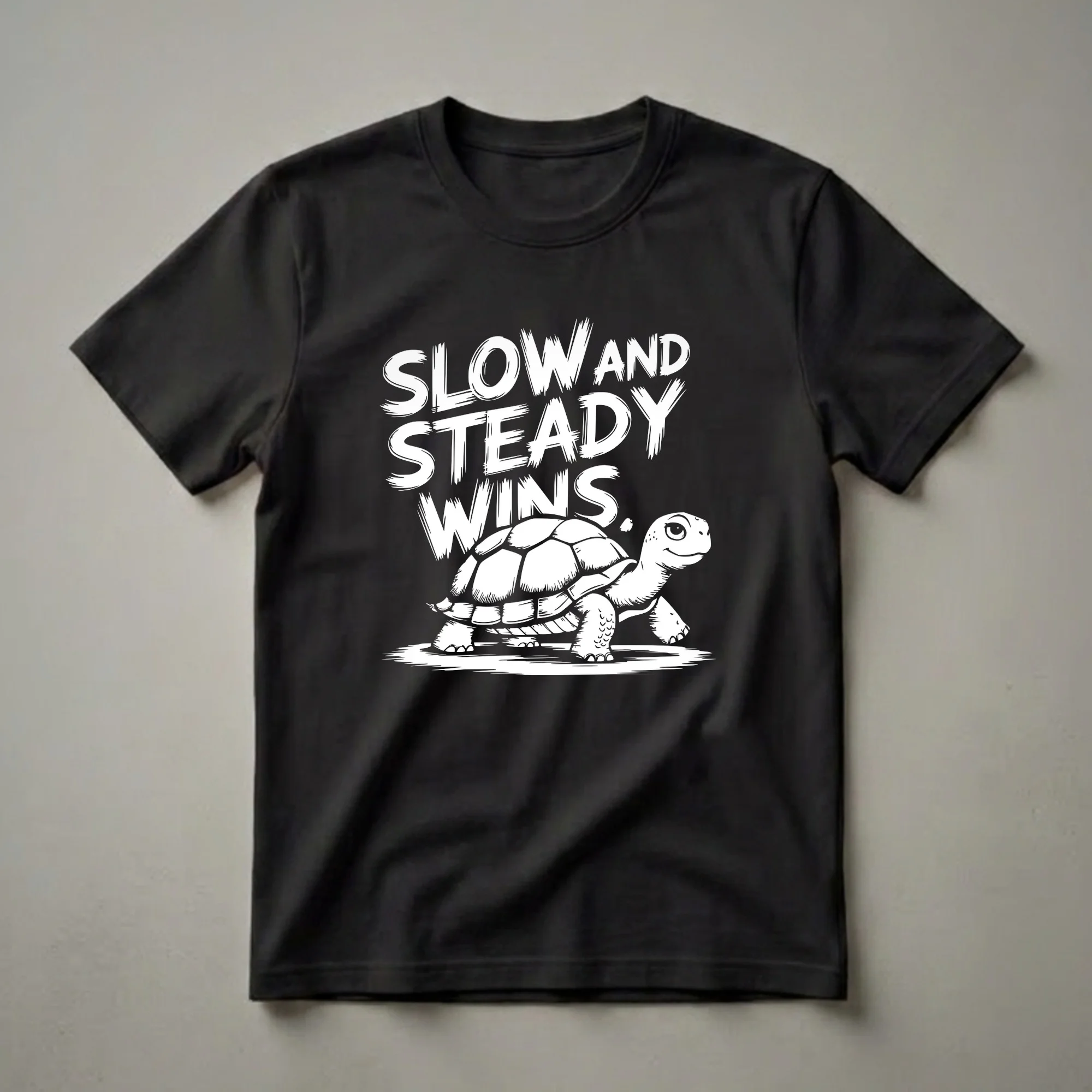 Kids who are fascinated by reptiles will love this "Slow and Steady Wins" graphic tee. The design features a friendly, cartoon-style turtle walking forward, with the motivational phrase "SLOW AND STEADY WINS" emblazoned above it in bold, brush-stroke lettering. Turtles, known for their longevity and deliberate pace, are a symbol of patience and resilience. This shirt is a wonderful way to encourage perseverance in young children, reminding them that consistent effort leads to success. It's a thoughtful birthday gift for any child turning 7, 8, or 9 who has a particular fondness for these shelled creatures. This t-shirt works well for everyday wear, whether at school, playing with friends, or attending a birthday party. It’s a fun and inspiring addition to any child's wardrobe, promoting a positive message with a charming animal theme. The graphic is rendered in a striking white against a contrasting black background, making the design pop.