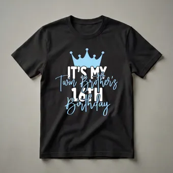 Siblings celebrating a milestone birthday will appreciate this unique graphic tee. The design features a prominent light blue crown, symbolizing royalty and celebration, positioned above bold white text that declares 'IT'S MY'. Below this, in a flowing light blue script, reads 'Twin Brother's', clearly identifying the recipient and the special relationship. The number '16th' is presented in large white numerals, emphasizing the significant sweet sixteen occasion, followed by 'Birthday' in the same light blue script as 'Twin Brother's'. This shirt is a thoughtful gift for any sister or brother looking to make their twin brother's 16th birthday memorable. It's a fantastic way to show pride and share in the excitement of turning sixteen. This t-shirt works well for birthday parties, family gatherings, or as a special surprise. The design is eye-catching and clearly communicates the celebratory nature of the event, making it a go-to tee for the birthday boy's sibling to wear or gift. Turning sixteen is a major life event, marking a transition into young adulthood, and this shirt captures that celebratory spirit for a twin brother.