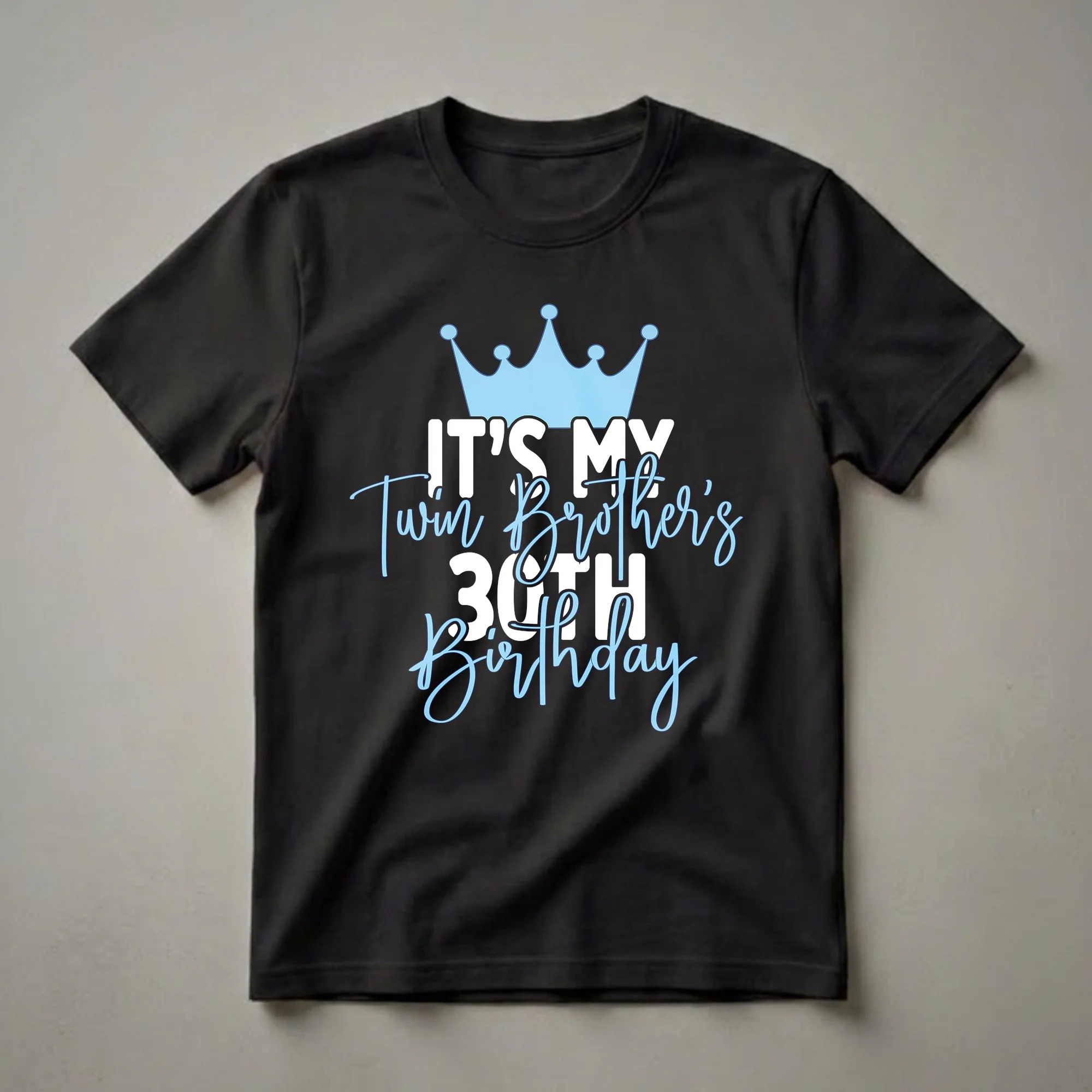 - Proudly wear your 'IT'S MY TWIN BROTHER'S 30TH BIRTHDAY' graphic tee with a regal light blue crown.