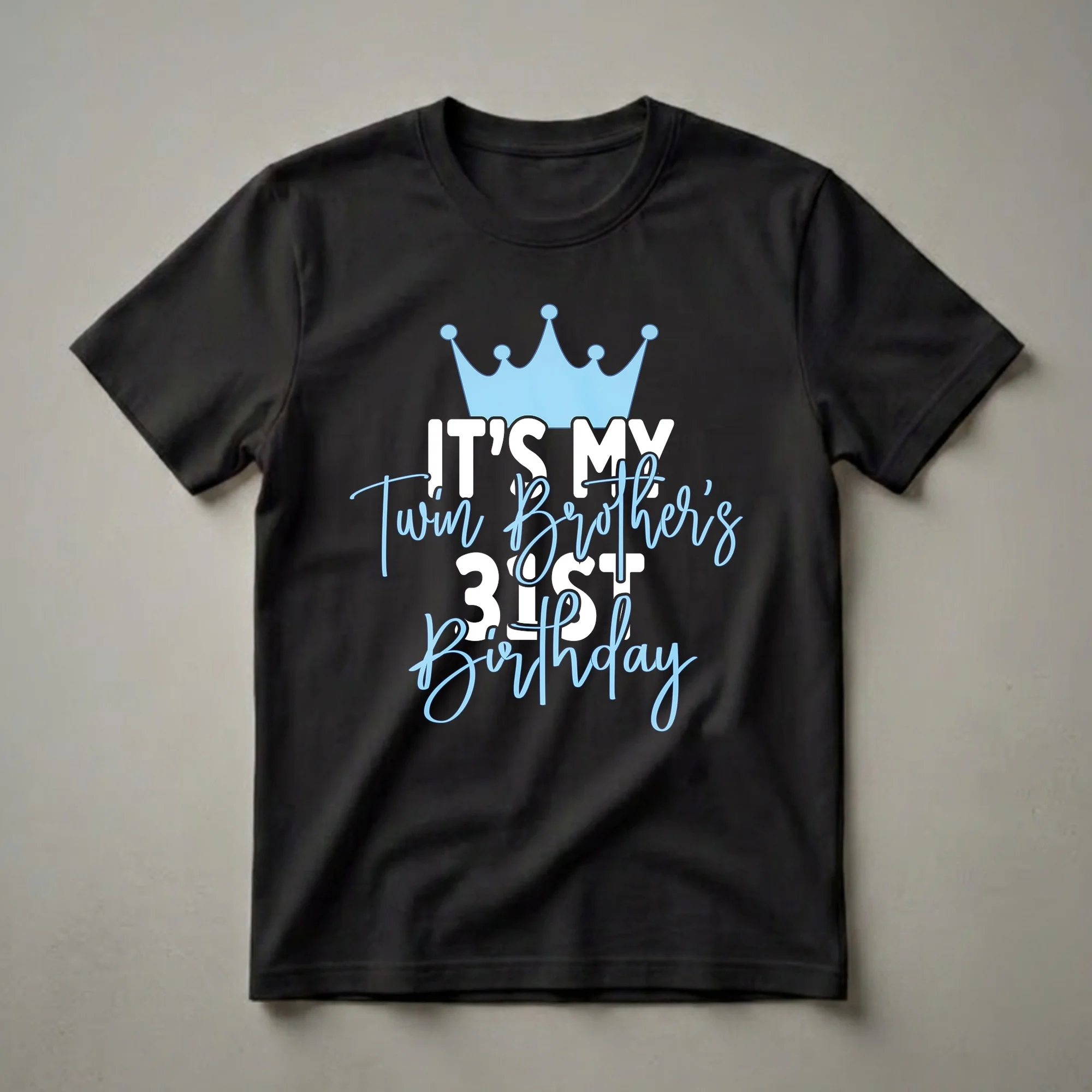 - Features a fun design with a crown and "It's My Twin Brother's 31st Birthday" text.