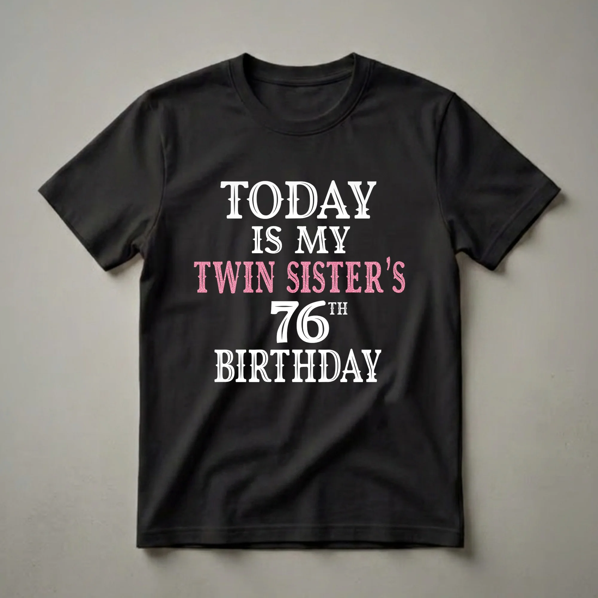 Seventy-six years is a significant milestone, and this graphic tee is designed to celebrate your twin sister's special day. The design features bold white lettering that reads 'TODAY IS MY' above 'TWIN SISTER'S' rendered in eye-catching pink glitter font. Below this, '76TH' is prominently displayed in large white numerals, followed by 'BIRTHDAY' in matching white lettering. This t-shirt is a fantastic way for a sibling to show their love and celebrate a twin sister turning 76. It makes a thoughtful gift for any sister who appreciates a touch of sparkle and a clear declaration of a milestone birthday. Imagine her wearing this at her birthday brunch or party, sharing smiles and memories. This shirt is a wearable declaration of sibling pride and a festive addition to any 76th birthday celebration, for the sister who has shared a lifetime of experiences with you. It's a unique way to honor her journey and the special bond you share.