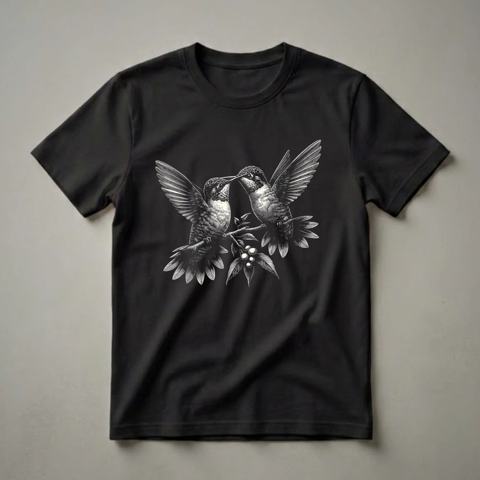 - Vintage graphic tee featuring two hummingbirds on a berry branch, beaks nearly touching.