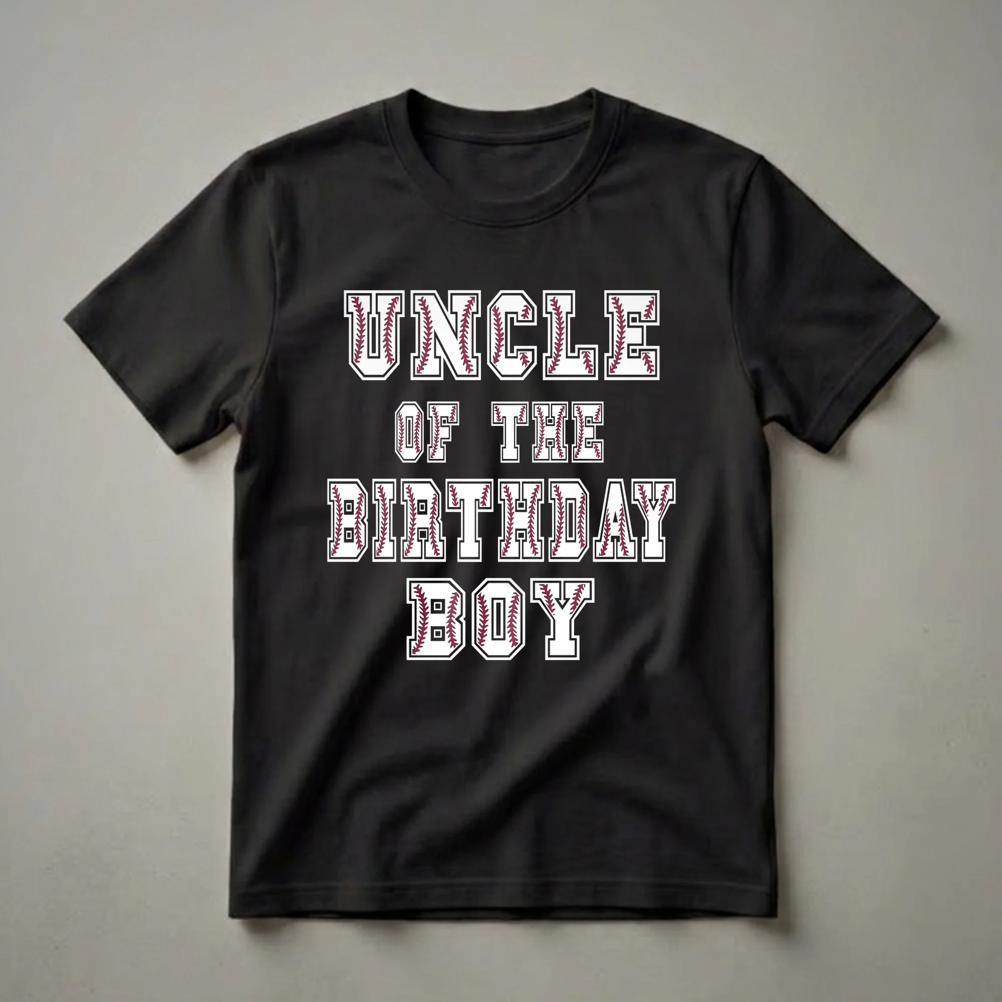 - Features bold, collegiate-style lettering spelling out "UNCLE OF THE BIRTHDAY BOY" with baseball stitching.