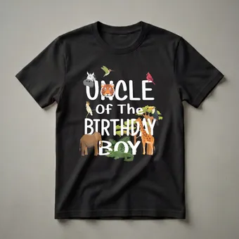The uncle of the birthday boy can show his festive spirit with this eye-catching graphic tee. The design features bold white lettering that spells out "UNCLE OF THE BIRTHDAY BOY," set against a black background. Surrounding the text is a vibrant collection of cartoon jungle animals, including a zebra, tiger, elephant, giraffe, alligator, toucan, cockatoo, cardinal, and hummingbird. Lush green foliage and trees add to the wild safari atmosphere. This shirt is a fantastic way for an uncle to join in the fun at a zoo-themed birthday party or any animal-lover's celebration. It makes a thoughtful gift for any uncle who wants to celebrate his nephew's special day in style. He will reach for this tee for birthday parties, family gatherings, or casual outings. This t-shirt is a fun statement piece for any uncle who enjoys celebrating milestones with his family and wants to showcase his role in the birthday festivities.