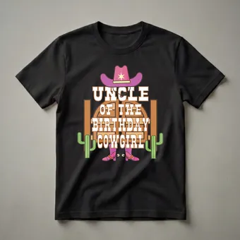 The uncle of the birthday cowgirl will reach for this festive tee to celebrate her special day. The graphic features bold white lettering with brown outlines that reads "UNCLE OF THE BIRTHDAY COWGIRL." Above the text sits a vibrant pink cowboy hat adorned with a yellow sheriff's star and a tan band. Below the text, a pair of pink cowgirl boots with orange accents and spurs are depicted, complete with a lasso string hanging from the hat. Flanking the central design are stylized green cacti, evoking a classic Western landscape. This shirt is a thoughtful gift for any uncle whose niece is celebrating a birthday with a rodeo or Western theme. It's great to wear to a birthday party, a rodeo event, or any casual gathering where you want to show off your proud uncle status. The design captures the spirit of the Wild West and the joy of celebrating a young cowgirl's milestone. This t-shirt is a fun way for uncles to participate in the birthday festivities and show their support for their favorite cowgirl.