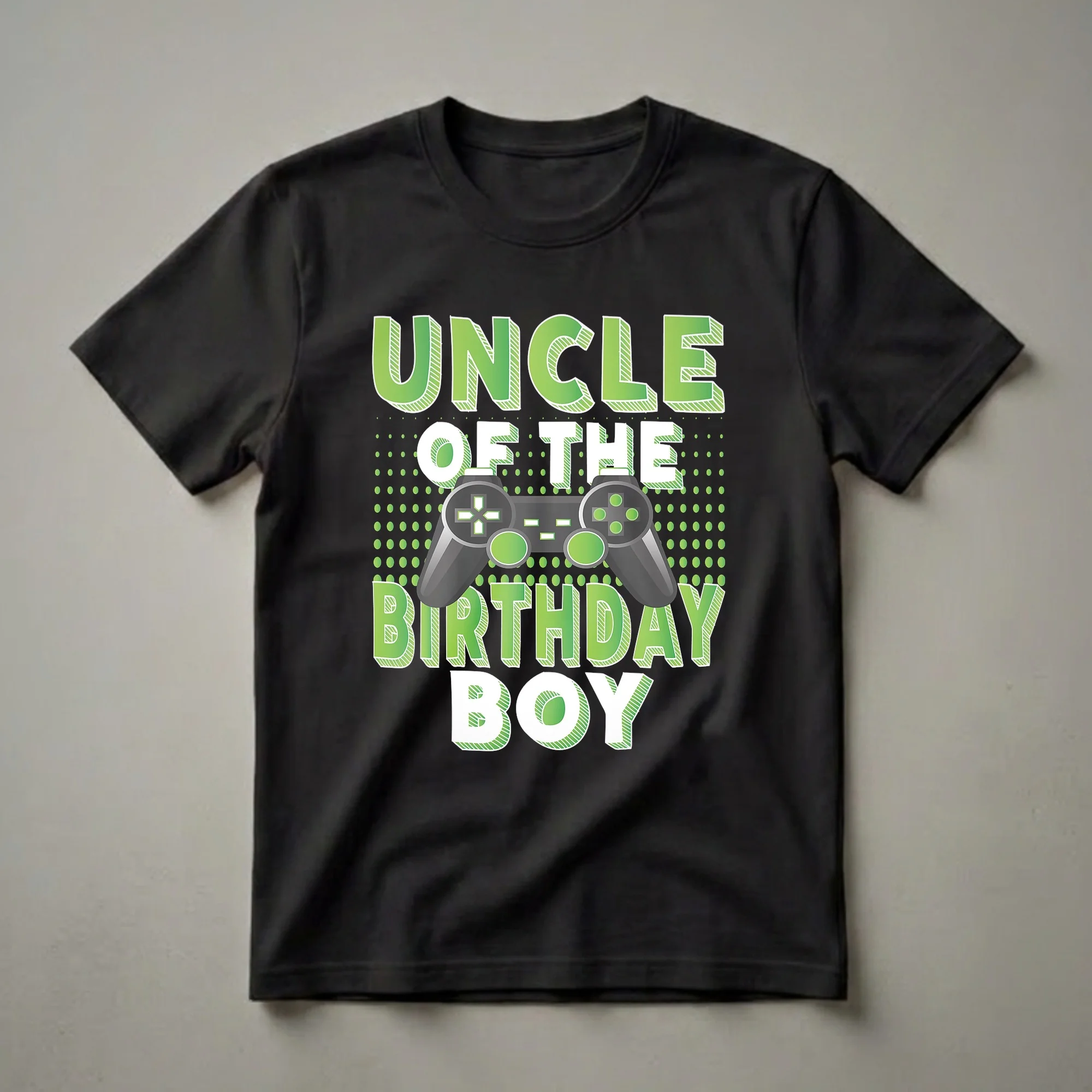 For the uncle who loves to celebrate his nephew's special day, this "Uncle of the Birthday Gamer Boy" t-shirt is a fantastic choice. The graphic features bold, green lettering with a white outline and a subtle striped texture, creating a vibrant, eye-catching design. Central to the artwork is a realistic illustration of a black video game controller, complete with green accents on the buttons and joysticks, symbolizing the birthday boy's passion for gaming. This tee is a thoughtful gift for any uncle who enjoys being part of his nephew's gaming adventures or birthday celebrations. It's a fun way to acknowledge his role and share in the excitement of the day. Imagine him wearing this shirt to the birthday party, game night, or any casual gathering where he wants to proudly represent his title. This shirt is a staple for any uncle who wants to show his support for the birthday boy's favorite hobby. It’s a great way to connect over shared interests and create lasting memories during birthday festivities. This apparel makes a thoughtful gift for any uncle who wants to stand out and share in the birthday fun.