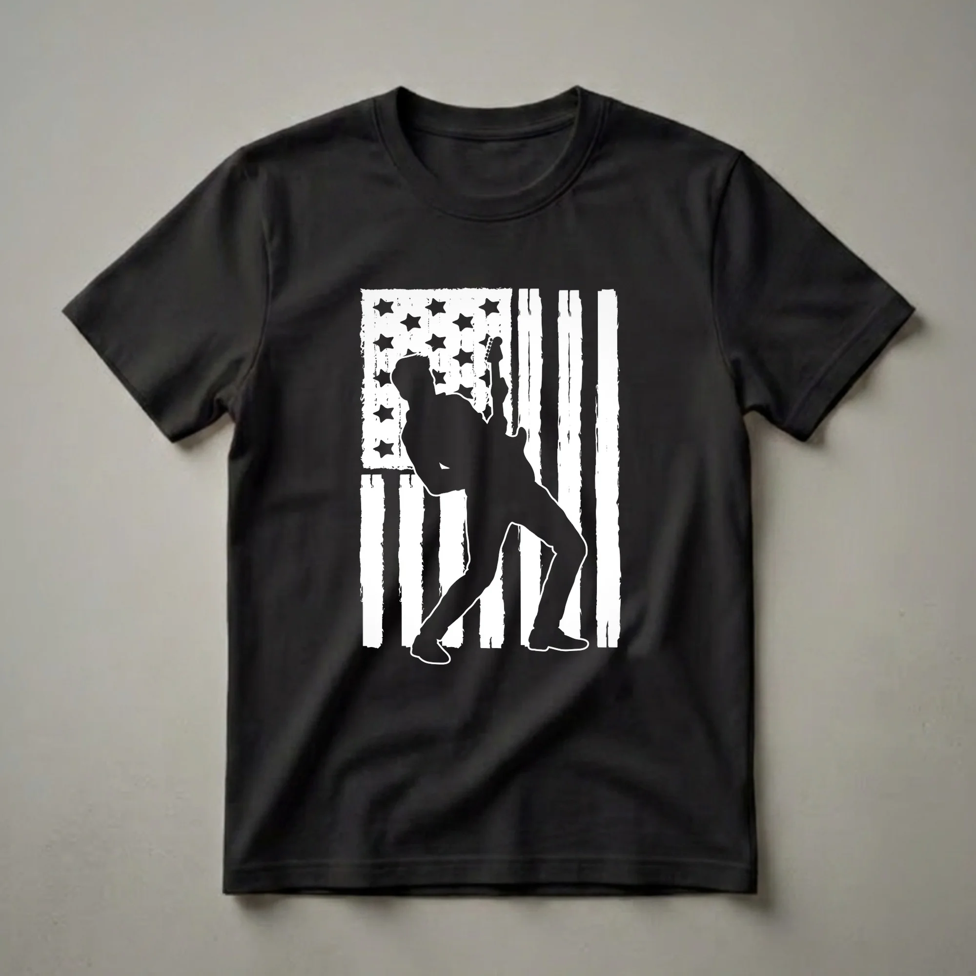 Guitarists who love their country will reach for this eye-catching tee. The design features a dynamic black silhouette of a musician passionately playing an electric guitar, set against a distressed American flag. The flag's bold stripes and stars create a powerful backdrop, symbolizing a deep connection to music and the USA. This graphic shirt is a staple for any guitarist's collection, suitable for wearing to jam sessions, concerts, or casual outings. It makes a thoughtful gift for the guitarist in your life who proudly celebrates their American heritage and their love for playing music. The electric guitar, a cornerstone of rock, blues, and country music, is celebrated in this patriotic design, making it a unique statement piece for any musician.