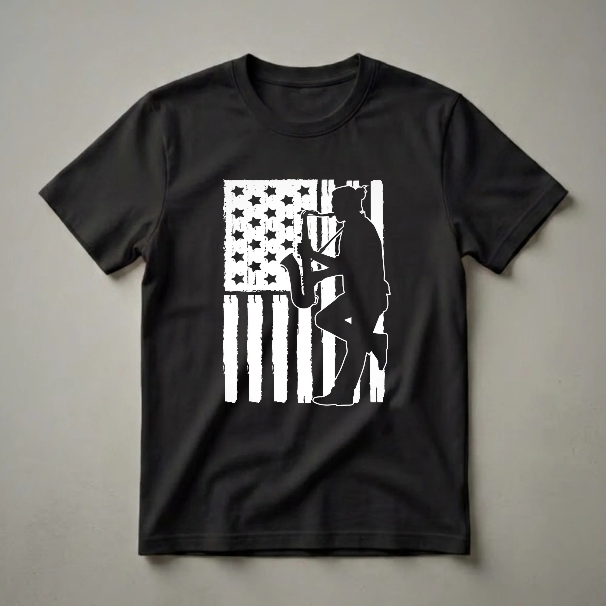 Saxophone players who want to express their patriotic spirit will reach for this eye-catching graphic tee. The design features a bold black silhouette of a musician playing a saxophone, set against a distressed American flag. This shirt is a testament to the fusion of musical passion and national pride. The saxophone, a versatile instrument known for its rich tone and expressive capabilities, is a staple in jazz, blues, and classical music. This apparel is worn by saxophonists, music students, and band members who appreciate the instrument's unique sound and its place in American musical heritage. It makes a thoughtful gift for the saxophonist in your life, whether they are a seasoned professional or a budding musician. Wear this t-shirt to band practice, a jazz club, or any casual gathering to showcase your love for music and the USA. It's a staple in the collection for any musician who cherishes their craft and their country.