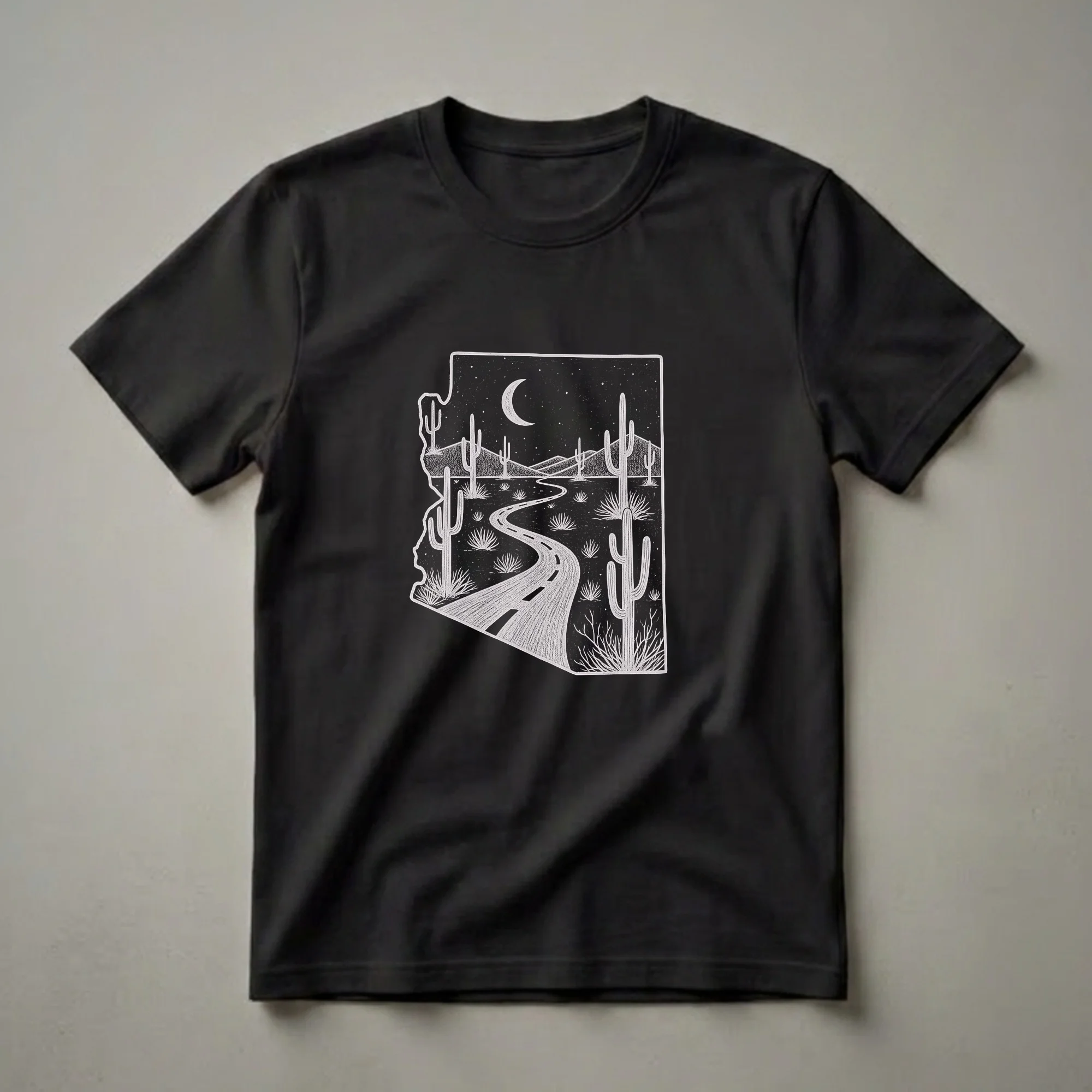 Arizona lovers and desert explorers will reach for this unique graphic tee, showcasing a vintage-inspired drawing of the Grand Canyon State. The design is contained within the iconic outline of Arizona, depicting a serene desert scene at night. Towering saguaro cacti stand guard alongside a winding road that stretches towards distant, silhouetted mountains. A crescent moon hangs in a sky dotted with stars, evoking the vastness and beauty of the Sonoran Desert. This shirt is a tribute to the rugged landscapes and open roads that define the American Southwest. It's a staple in the collection for anyone who cherishes the unique charm of Arizona, whether they call it home or dream of visiting. This tee makes a thoughtful gift for travelers, road trip enthusiasts, or anyone who appreciates the striking natural beauty of the desert. Wear it on your next adventure or as a reminder of your favorite desert escape.