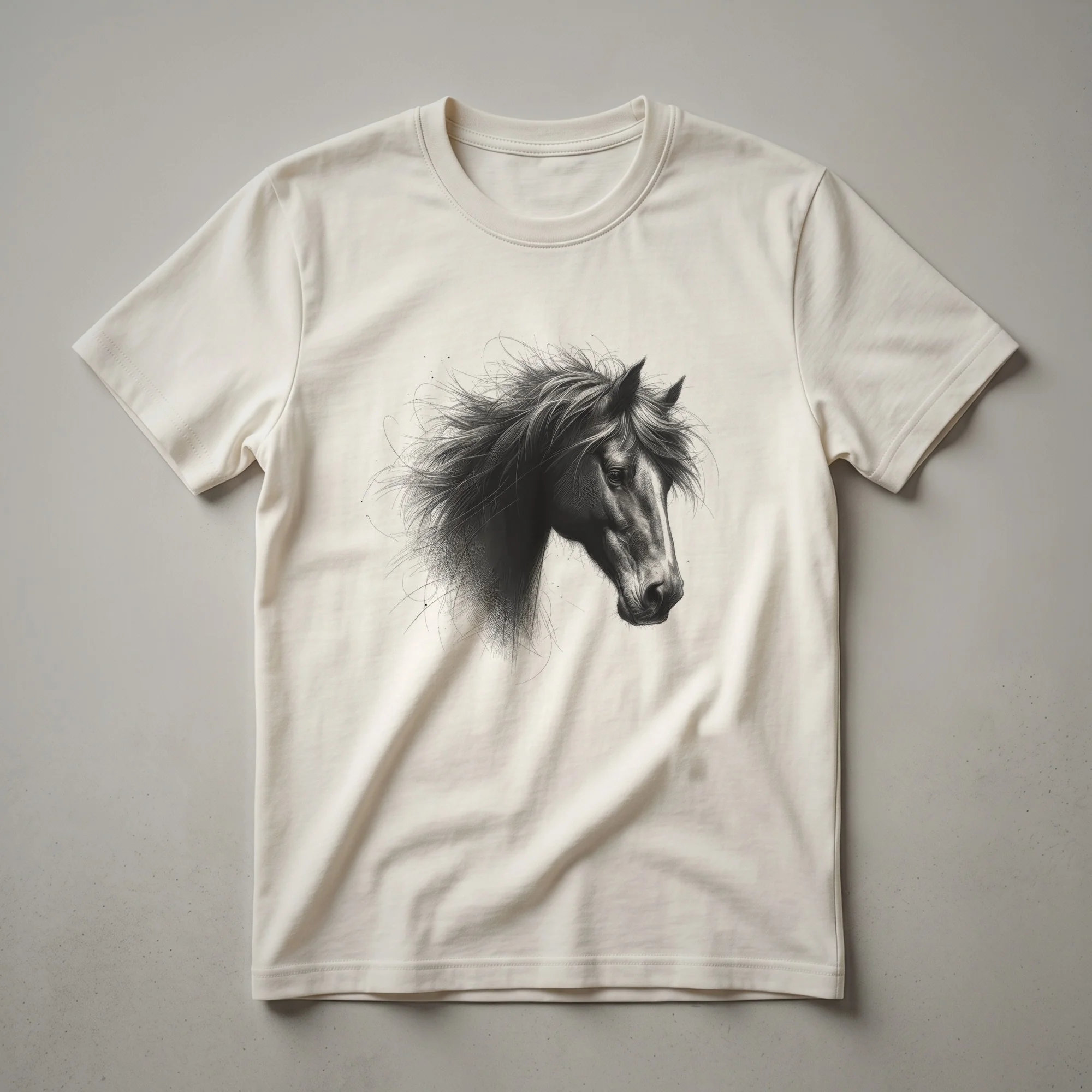 Equine enthusiasts will appreciate the classic artistry of this vintage black horse drawing t-shirt. The design features a detailed, black and white line drawing of a horse's head in profile, capturing the animal's noble profile and flowing mane. Horses, known for their strength, grace, and historical partnership with humans, have long symbolized freedom and power. This graphic tee is a subtle yet striking way for any horse lover to express their passion. It's a go-to tee for casual outings, equestrian events, or simply relaxing at home. This shirt makes a thoughtful gift for the horse mom, rider, or anyone who admires these magnificent creatures. Wear it to the stable, a country fair, or while enjoying a trail ride to showcase your connection to the equine world.