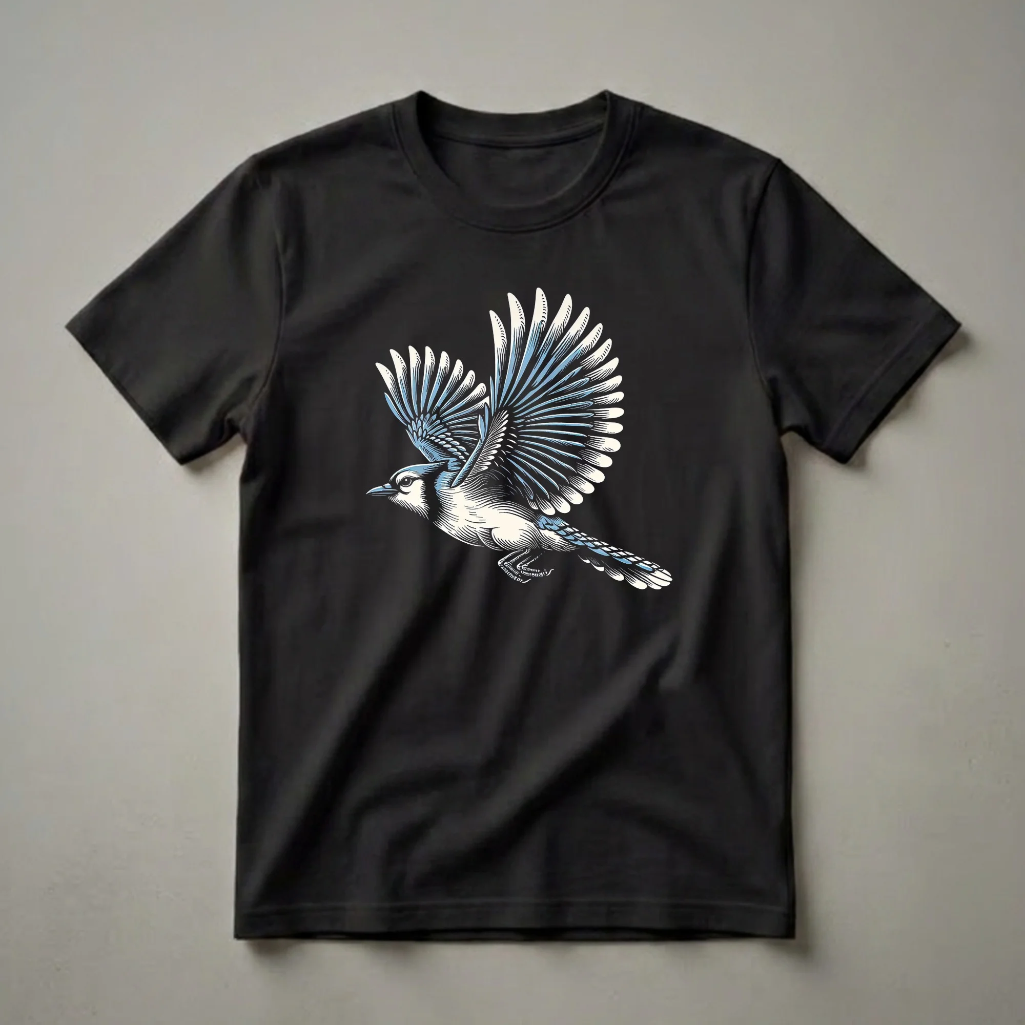Bird watchers and nature enthusiasts will appreciate the detailed artistry of this vintage-style blue jay t-shirt. The graphic features a striking illustration of a blue jay captured mid-flight, its wings spread wide, showcasing the intricate feather detail in shades of blue, white, and black. This eye-catching design evokes a sense of movement and freedom, reminiscent of the bird's natural habitat in eastern North America, where they are known for their intelligence and vibrant calls. Blue jays are often found in woodlands and suburban areas, and this tee serves as a beautiful tribute to these charismatic creatures. This shirt is a thoughtful gift for anyone who admires wildlife or enjoys the outdoors. It's a go-to tee for casual outings, nature walks, or simply relaxing at home while celebrating your passion for birds. The detailed linework and classic aesthetic make this graphic tee a standout piece for any wardrobe, appealing to both women and men who appreciate fine art and the natural world. Wear it to your next birdwatching expedition or a casual gathering with fellow nature lovers.