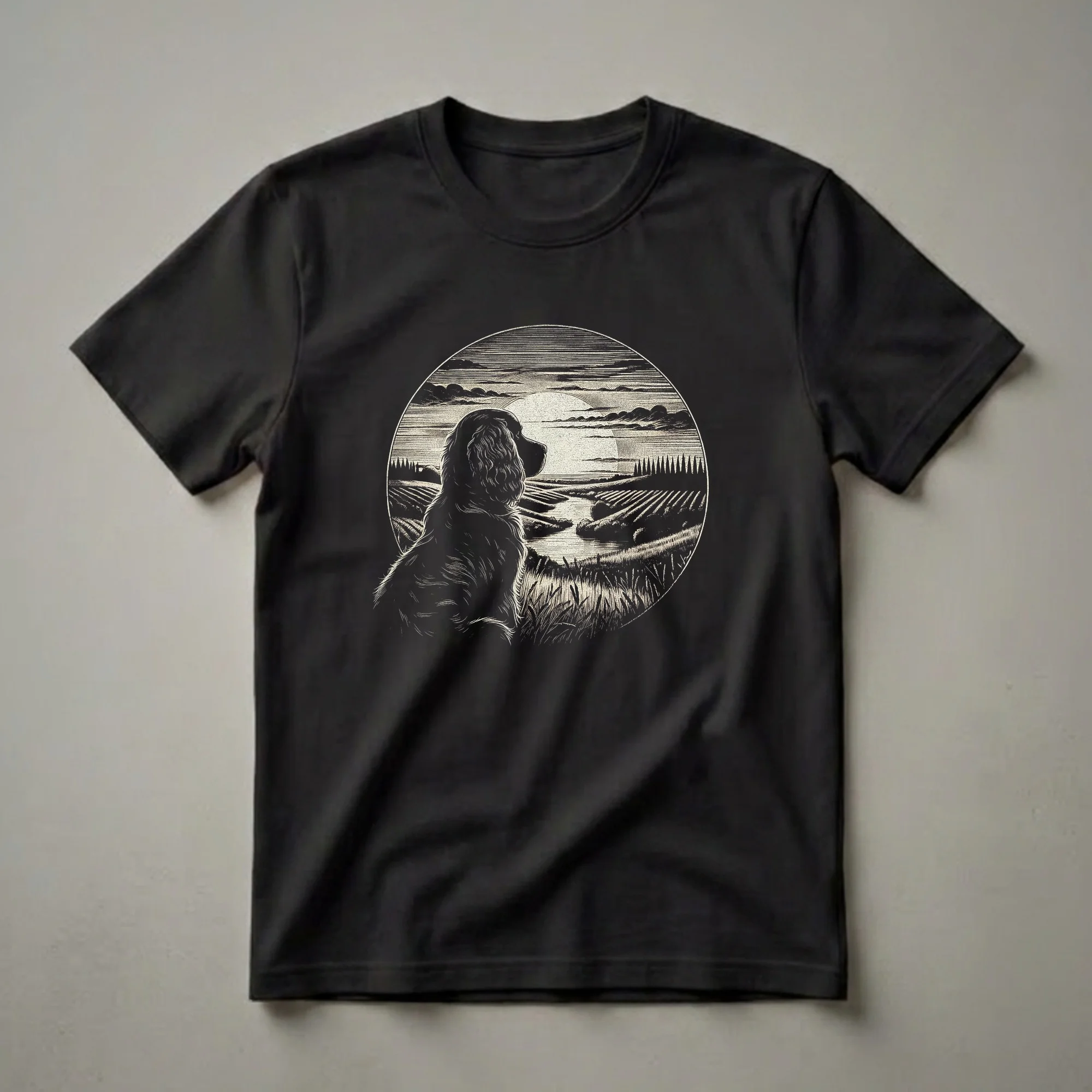Boykin Spaniel owners who appreciate the breed's heritage will reach for this unique graphic tee. The design features a detailed, vintage-style illustration of a Boykin Spaniel sitting in tall grass, gazing out at a serene rural landscape. A large, textured moon or sun hangs in the sky, casting a warm glow over rolling fields and a winding river. The art style evokes classic woodcut prints, giving it a timeless, retro feel. Boykin Spaniels, originally bred in South Carolina for flushing waterfowl and retrieving ducks, are known for their intelligence and eagerness to please. This shirt captures the quiet contemplation of a loyal companion in its natural element. It makes a thoughtful gift for any Boykin Spaniel enthusiast, whether they are a hunter, a family pet owner, or simply someone who admires this distinctive breed. Wear this t-shirt on your next outdoor adventure, to a casual gathering, or simply while relaxing at home, celebrating your connection with this remarkable dog. This tee is a staple for any dog lover's wardrobe, offering both style and a nod to canine history.