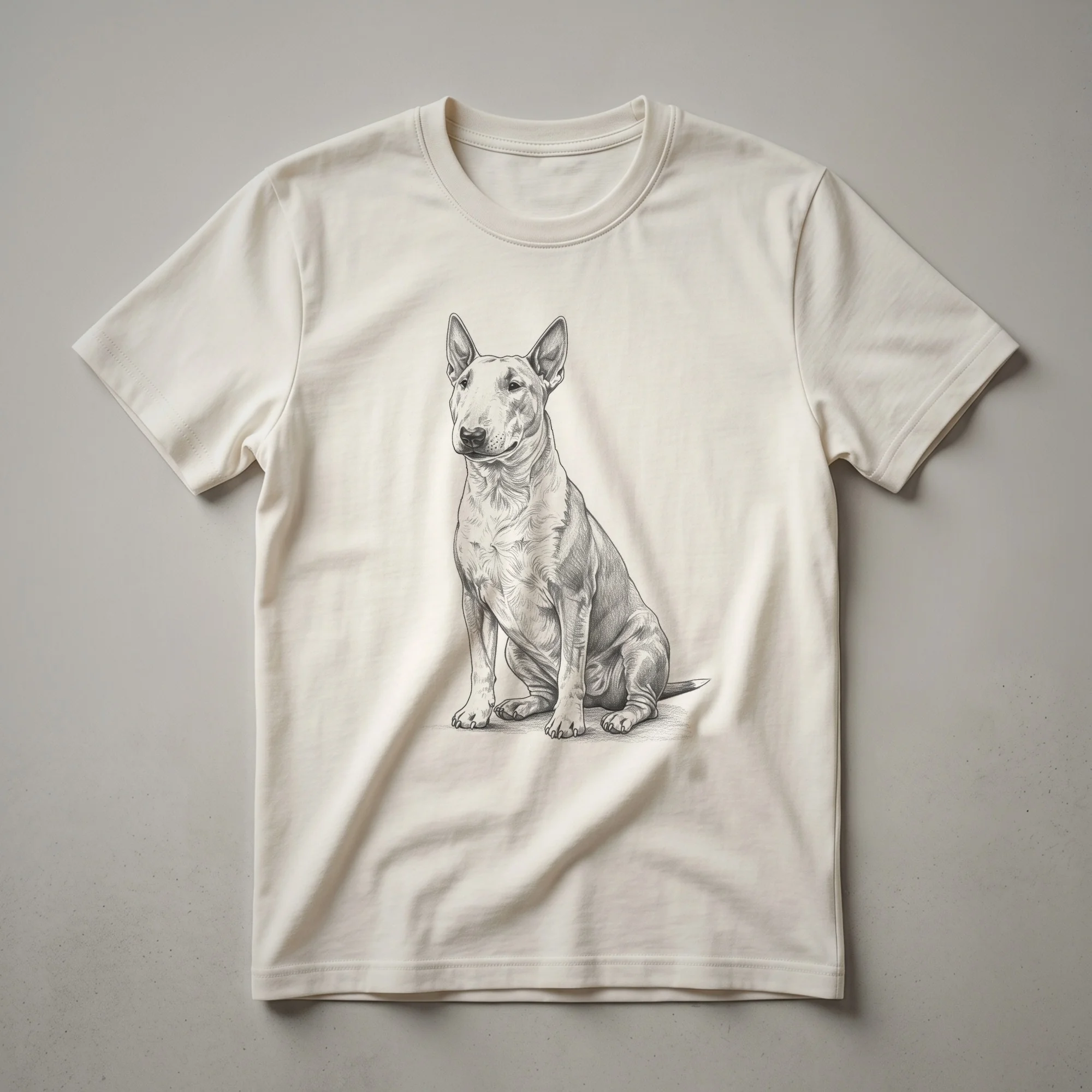 - Features a unique hand-drawn illustration of a sitting Bull Terrier.