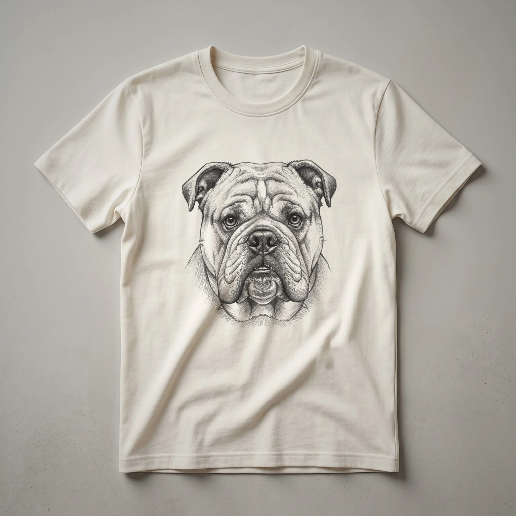 Bulldog owners who appreciate classic artistry will reach for this unique graphic tee. The design features a striking hand-drawn illustration of a bulldog's face, rendered in a vintage style that evokes a sense of timeless charm. Bulldogs, known for their distinctive wrinkled faces and muscular build, originated in England and were historically used for bull-baiting before evolving into beloved companions. This shirt captures the breed's iconic look with a detailed, artistic touch. It's a staple in the collection for anyone who adores these loyal and affectionate dogs. This t-shirt works well for casual outings, dog park visits, or simply relaxing at home. It makes a thoughtful gift for the bulldog mom or dad in your life who cherishes their four-legged friend. Wear it to express your passion for this wonderful breed.