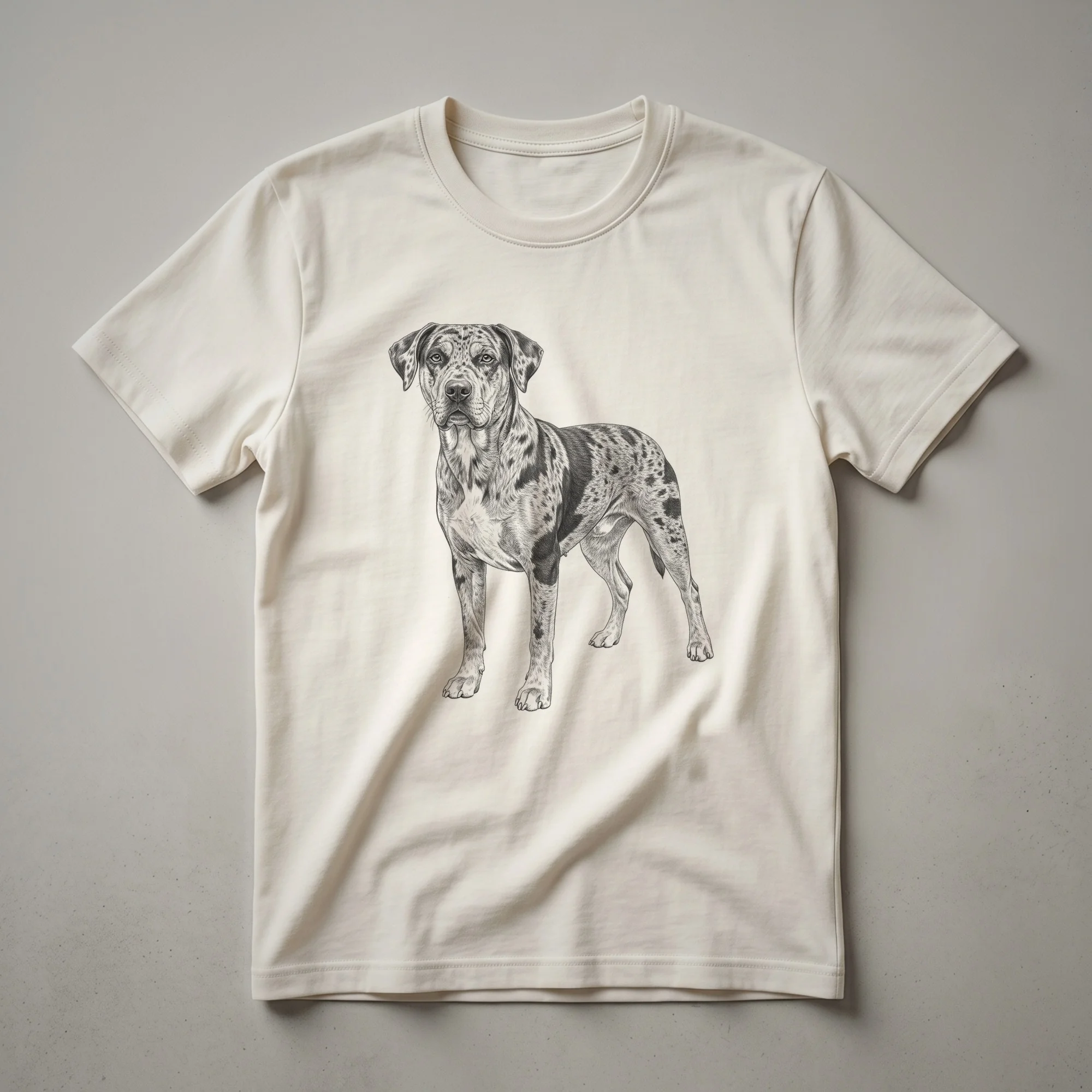 Catahoula Leopard Dog owners who appreciate unique artistry will reach for this vintage-style graphic tee. The design features a detailed drawing of a Catahoula Leopard Dog's head, rendered with a classic, artistic flair that evokes a sense of nostalgia. This striking visual captures the breed's distinctive appearance, known for its striking coat patterns and intelligent gaze. Originating from Louisiana, the Catahoula Leopard Dog was historically used for herding and hunting wild hogs, showcasing their versatility and robust nature. This shirt is more than just apparel; it's a statement piece for those who understand and admire this remarkable breed. It makes a thoughtful gift for any Catahoula enthusiast, whether they are celebrating a birthday or simply want to express their connection to their canine companion. Wear this tee to your next dog park visit or casual outing to spark conversations with fellow dog lovers. This t-shirt is a staple for any dog mom or dog dad who wants to showcase their pride in their unique furry family member.