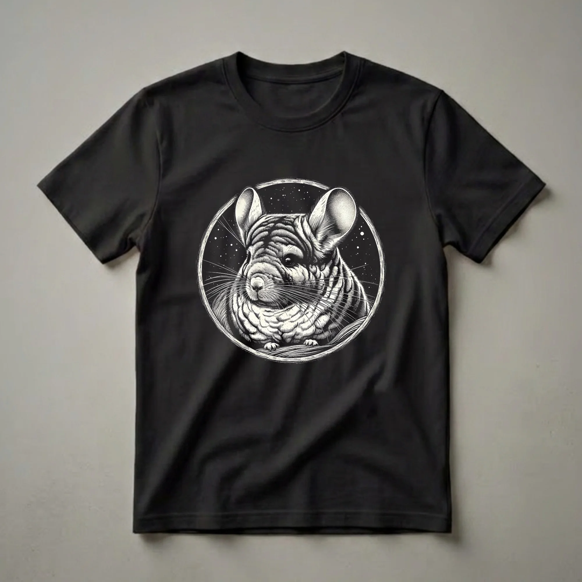 Chinchilla owners and wildlife enthusiasts will appreciate the intricate detail of this vintage-style chinchilla graphic tee. The artwork features a chinchilla rendered in a classic woodcut or linocut style, presented within a circular frame against a stark black background. Tiny white dots scattered around the chinchilla evoke a starry night sky or a dusty environment, adding to the artistic appeal. Chinchillas, native to the Andes Mountains of South America, are known for their incredibly dense, soft fur and their nocturnal habits. This shirt is a thoughtful gift for anyone who admires these fascinating rodents, whether they are pet owners or simply appreciate unique animal art. This tee works well for casual outings, nature walks, or as a conversation starter among fellow animal lovers. It's a staple in the collection for those who seek distinctive apparel that celebrates the natural world. The detailed linework captures the chinchilla's large ears and expressive eyes, making this shirt a standout piece for any wardrobe.