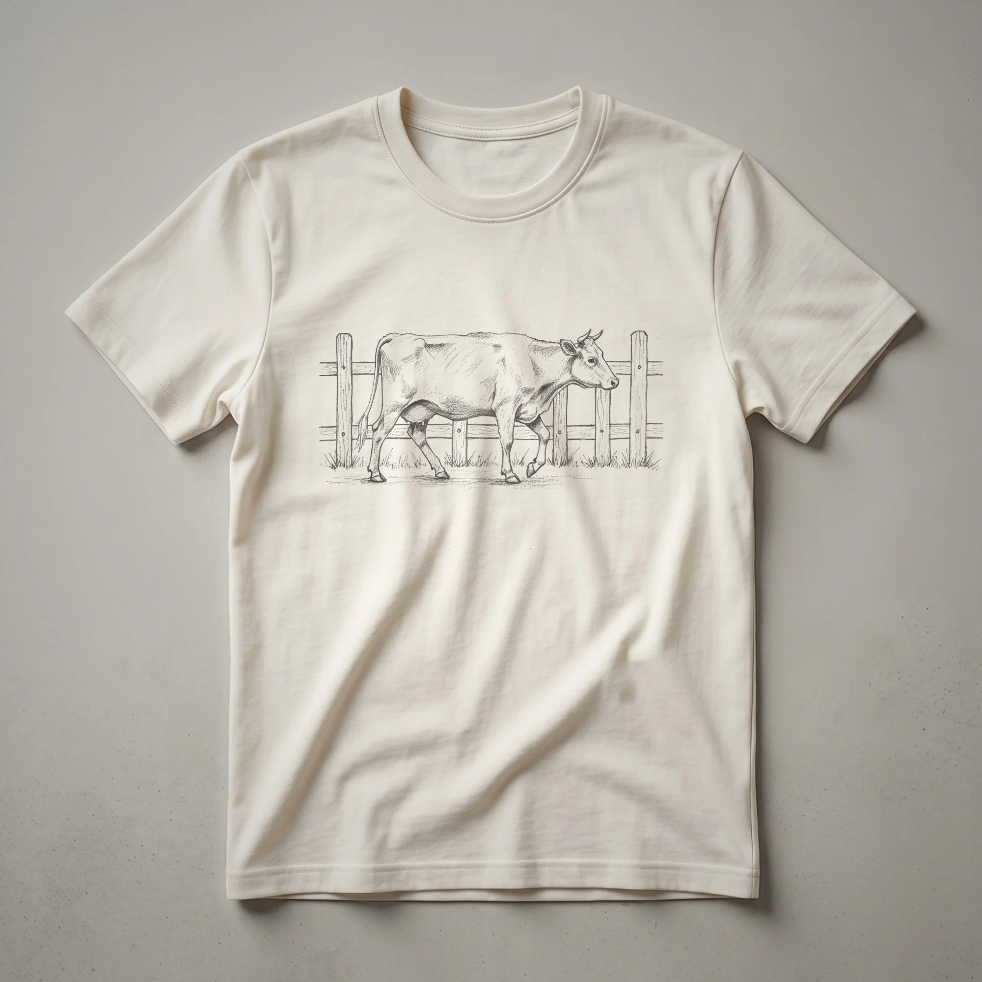 - Graphic t-shirt featuring a vintage cow and fence drawing.