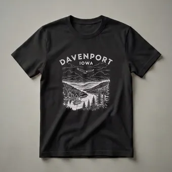 Davenport, Iowa residents and visitors can now wear their pride with this striking graphic t-shirt. The design features a detailed, vintage-style illustration that captures the essence of the Mississippi River. Dominating the scene is a classic steamboat, its smokestack billowing steam as it navigates the water, evoking a sense of historical river travel. Above, an eagle soars through a cloudy sky, a symbol of American heritage and the wild beauty of the plains. The landscape is framed by rolling hills covered in dense pine forests, creating a picturesque vista that speaks to the natural charm of the region. This tee is a perfect way for anyone who calls Davenport home, or who has fond memories of visiting, to express their connection to the city. It makes a thoughtful gift for Iowans, history buffs, or anyone who appreciates vintage travel art. Wear this shirt to local events, casual outings, or while exploring the Quad Cities area to spark conversations about your favorite Iowa city. This unique t-shirt is a staple for any wardrobe celebrating local pride.