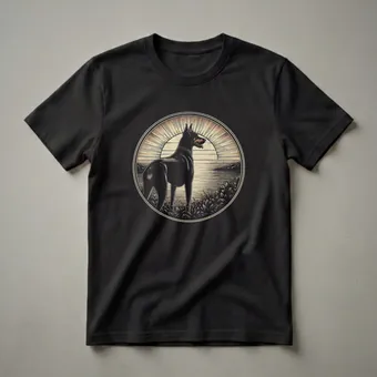 Doberman Pinscher owners who appreciate classic art will reach for this unique graphic tee. The design features a striking black Doberman standing proudly in a field of tall grass, gazing towards a stylized retro sunset. The circular emblem evokes a vintage travel poster or a classic emblem, with radiating lines representing the sun's rays and horizontal lines suggesting water or a distant landscape. Dobermans, known for their intelligence and loyalty, were originally bred in Germany in the late 19th century. This shirt captures a serene moment, blending the dog's noble presence with a nostalgic aesthetic. It's a thoughtful gift for any Doberman mom or dad who cherishes their canine companion. Wear this t-shirt to casual outings, dog park visits, or while relaxing at home, celebrating the bond you share with your elegant Doberman. This apparel is a staple for any dog lover's wardrobe, offering a blend of style and canine appreciation.