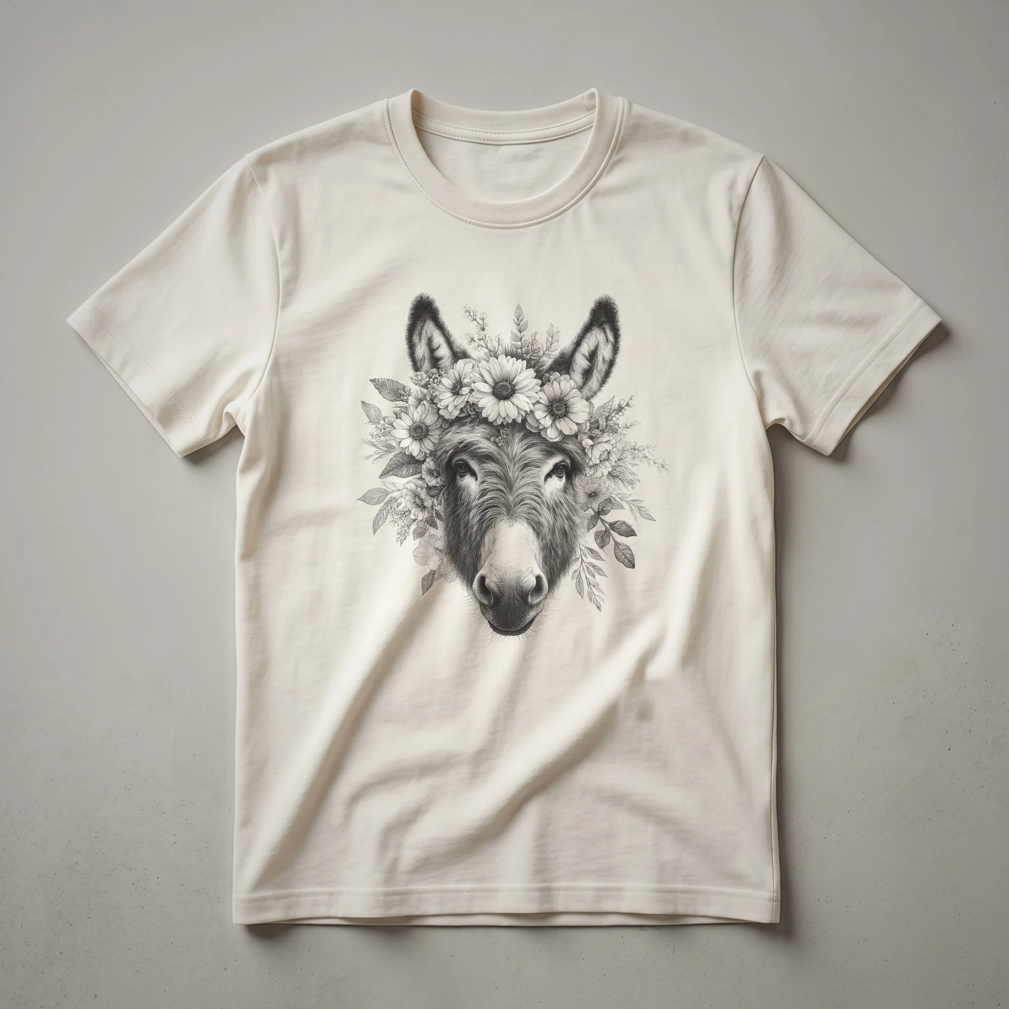 - Vintage donkey face drawing tee adorned with delicate blooming flowers, capturing farm charm.
