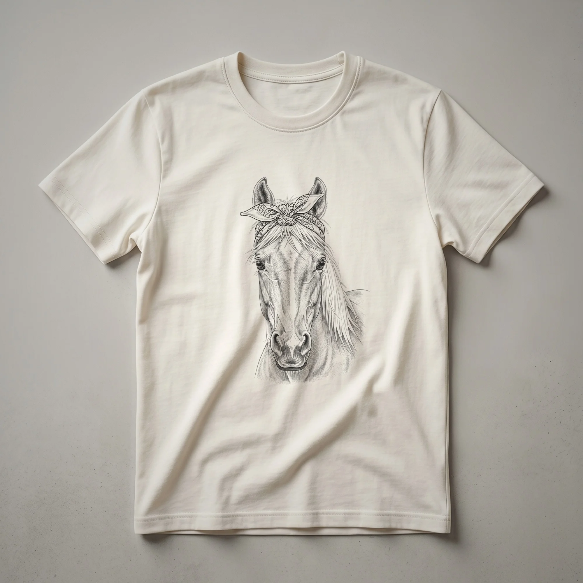 Horse moms who cherish their equine companions will appreciate this unique graphic tee. The design features a striking black and white line drawing of a horse's head, adorned with a classic bandana tied around its neck. This artistic rendering evokes a vintage aesthetic, reminiscent of old-school equestrian art and apparel. Horses, known for their strength, grace, and historical partnership with humans, are celebrated in this eye-catching design. This t-shirt is more than just clothing; it's a statement for those who understand the deep bond between a rider and their horse. Whether you're heading to the stable, a casual outing, or a horse show, this shirt offers a comfortable and stylish way to express your passion. It makes a thoughtful gift for the horse mom in your life who is always thinking about her four-legged friend. This tee works well for everyday wear, allowing you to carry your love for horses with you wherever you go. The detailed drawing captures the noble spirit of the horse, making it a staple in any equestrian's wardrobe.