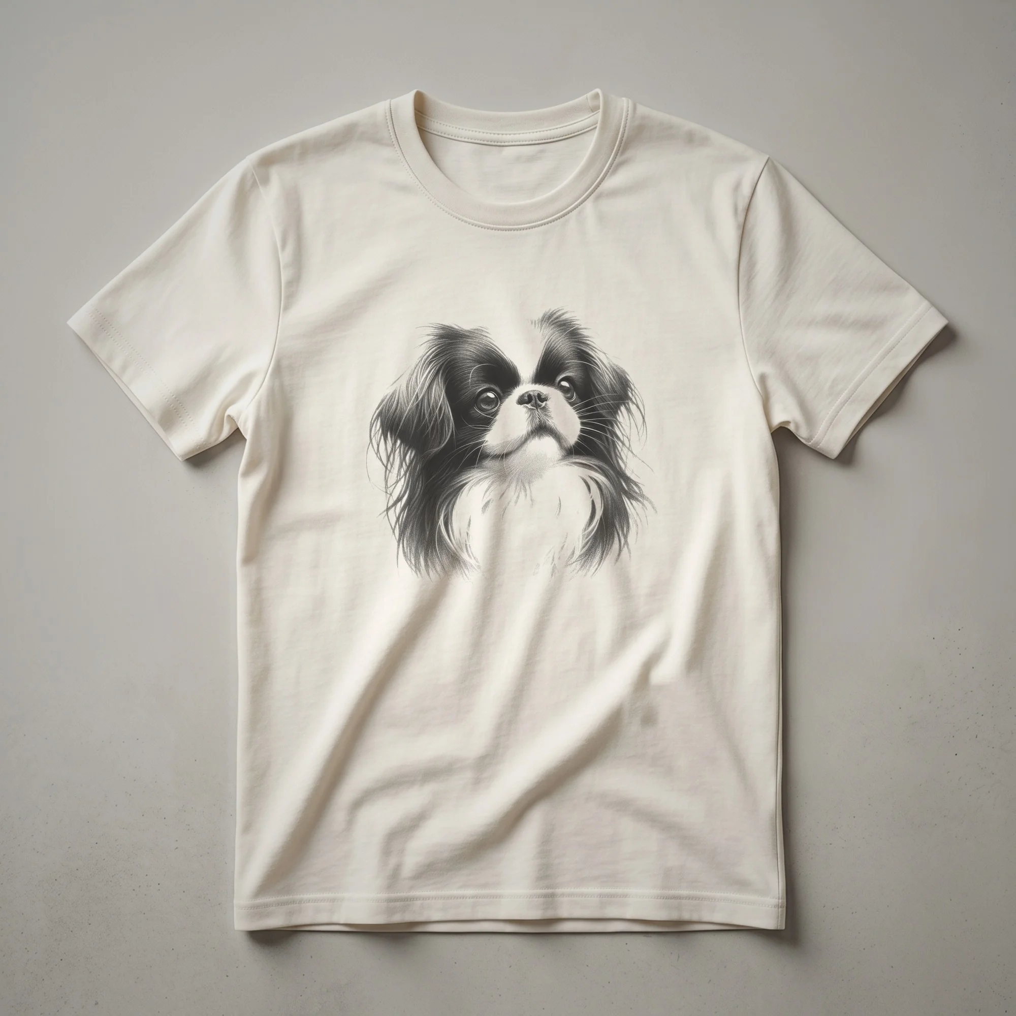 Japanese Chin owners who appreciate classic artistry will reach for this unique t-shirt. The design features a detailed, vintage-style line drawing of a Japanese Chin, capturing the breed's distinctive features with elegant simplicity. Known for their regal appearance and affectionate nature, Japanese Chins have a long history as cherished companions, particularly within Japanese and Chinese royalty. These small dogs, often described as cat-like in their independence, are also known for their playful antics and gentle demeanor. This graphic tee is a wonderful way for enthusiasts to express their admiration for this charming breed. It makes a thoughtful gift for any Japanese Chin mom or dad, or for someone who simply admires fine animal art. Wear this shirt to your next dog park visit or casual outing to spark conversations about your favorite canine companion. This comfortable tee is a staple for any dog lover's wardrobe, offering a touch of vintage charm and a clear display of breed appreciation.