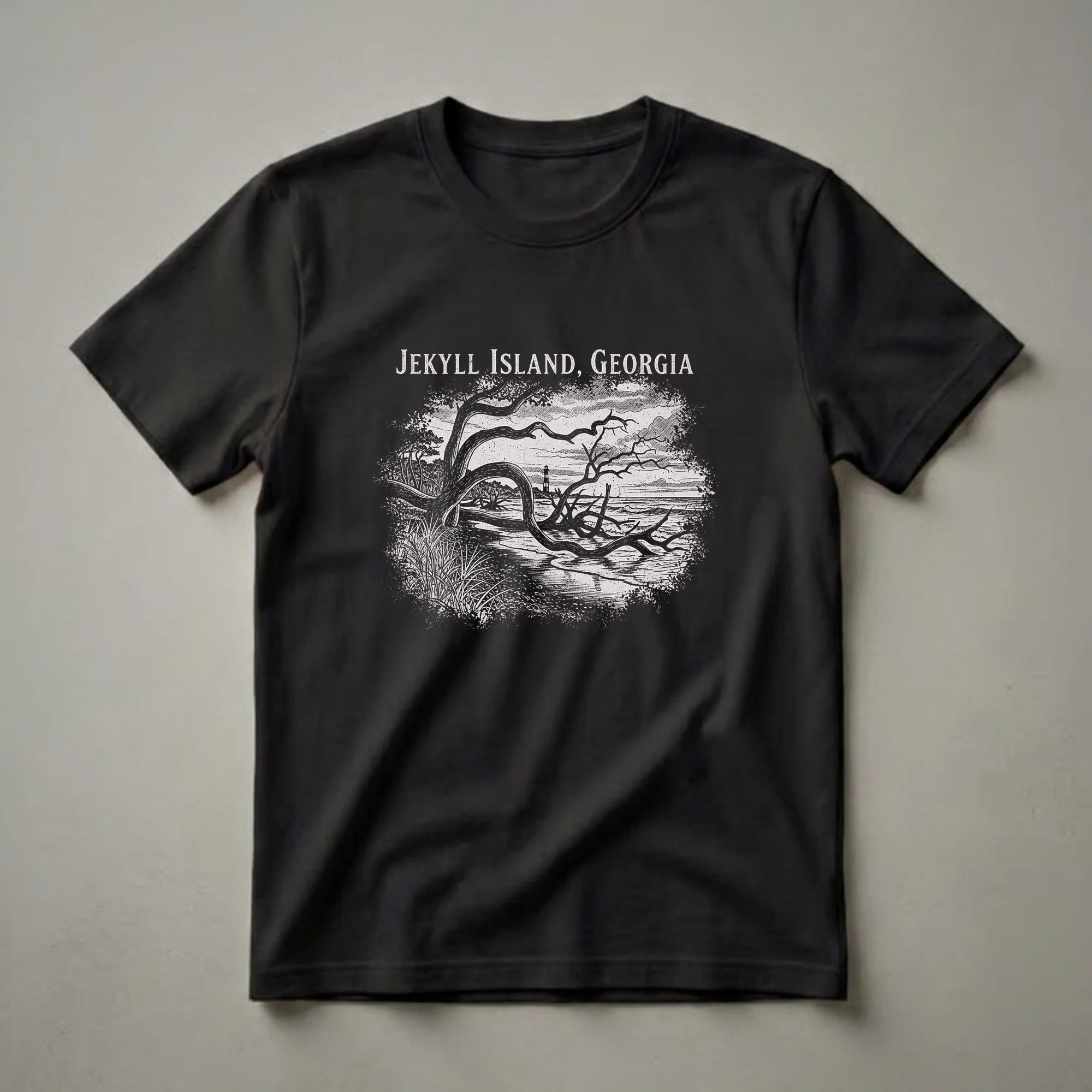 Jekyll Island, Georgia, is a place where natural beauty meets coastal history, and this graphic tee captures that essence. The design showcases a striking sketch art scene, dominated by the gnarled, weathered branches of driftwood trees reaching towards the sky. In the distance, a classic lighthouse stands sentinel against a backdrop of textured clouds and the gentle waves of the Atlantic Ocean. Lush coastal grasses frame the foreground, adding a touch of wild, untamed beauty to the composition. This t-shirt is a tribute to the unique landscape of Georgia's Golden Isles, a region known for its pristine beaches and historic charm. Jekyll Island itself is one of the state's barrier islands, offering a serene escape and a glimpse into a bygone era. This apparel is a thoughtful gift for anyone who cherishes memories of this coastal gem or dreams of visiting its shores. Wear this shirt to remember your vacation or to showcase your love for the Georgia coast. It's a staple for any wardrobe celebrating coastal living and vintage aesthetics. This tee works well for residents and visitors alike who appreciate the island's distinctive scenery.