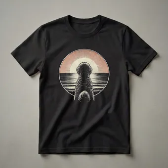 Labradoodle owners who appreciate a touch of vintage flair will reach for this unique graphic tee. The design features a stylized Labradoodle, viewed from behind, gazing out at a serene ocean scene. A retro sunburst, rendered in warm coral and cream tones with radiating lines, sits behind the dog and the water, evoking a sense of nostalgia and calm. The art style employs a textured, almost woodcut-like aesthetic, with bold linework and a limited color palette that enhances its vintage appeal. Labradoodles, known for their friendly disposition and intelligence, are a popular crossbreed, often sought after for their hypoallergenic coats. This shirt captures a moment of quiet contemplation, a perfect visual for anyone who finds peace by the water with their canine companion. It makes a thoughtful gift for the Labradoodle mom in your life who cherishes her furry friend and enjoys a relaxed, retro vibe. Wear this t-shirt on casual outings, to the dog park, or simply while relaxing at home, celebrating the special bond you share with your beloved Labradoodle.