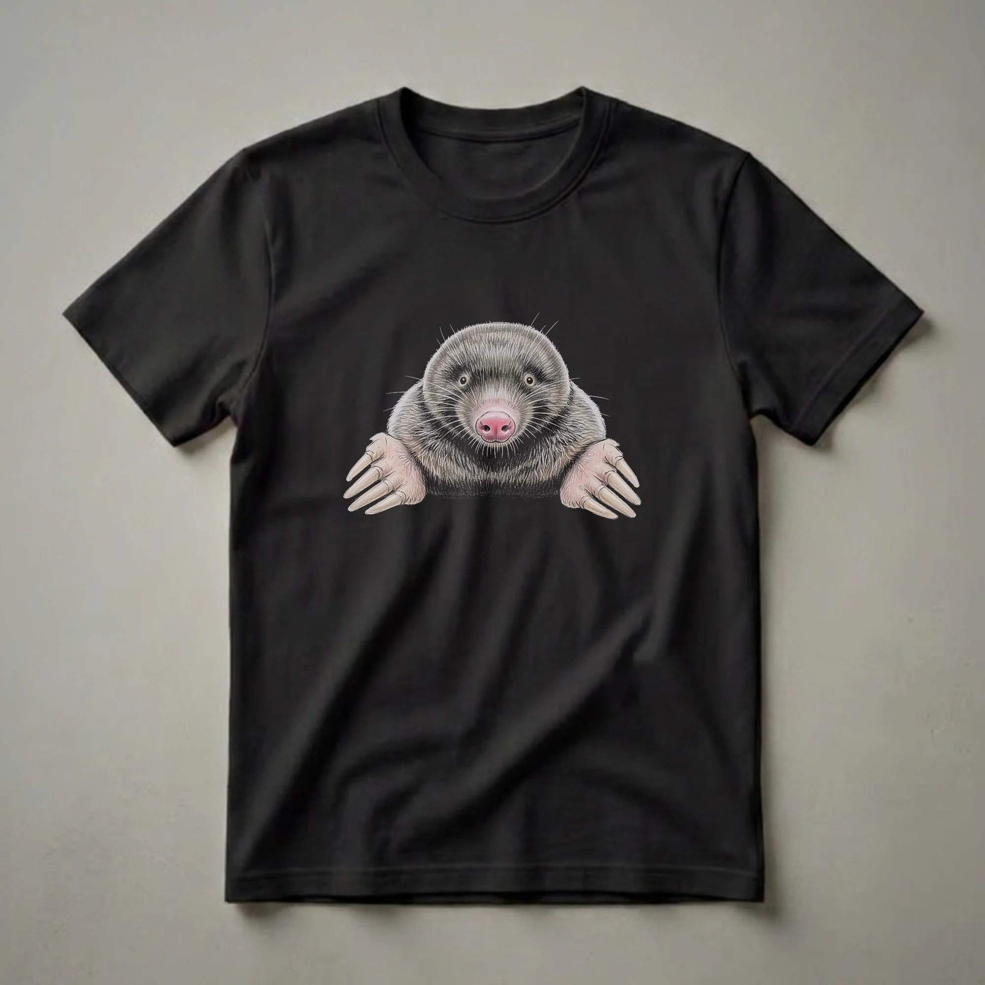Wildlife enthusiasts who appreciate the often-unseen inhabitants of our planet will reach for this striking t-shirt. The design features a meticulously rendered drawing of a mole, its fur detailed with fine lines and its prominent pink nose and large claws clearly visible. Moles are fascinating mammals known for their subterranean lifestyle, spending most of their lives underground digging extensive tunnel systems. They are found across North America, Europe, and Asia, inhabiting diverse environments from forests to meadows, wherever the soil is suitable for burrowing. This artistic depiction captures the essence of these unique creatures, making it a thoughtful gift for anyone who admires their specialized adaptations for a life beneath the surface. This graphic tee is great to wear on nature walks, to casual gatherings, or simply while enjoying a quiet day at home, celebrating the intricate beauty of the natural world. It’s a conversation starter for those who understand the importance of these often-overlooked animals in their ecosystems. This shirt is a staple for any nature lover's wardrobe.