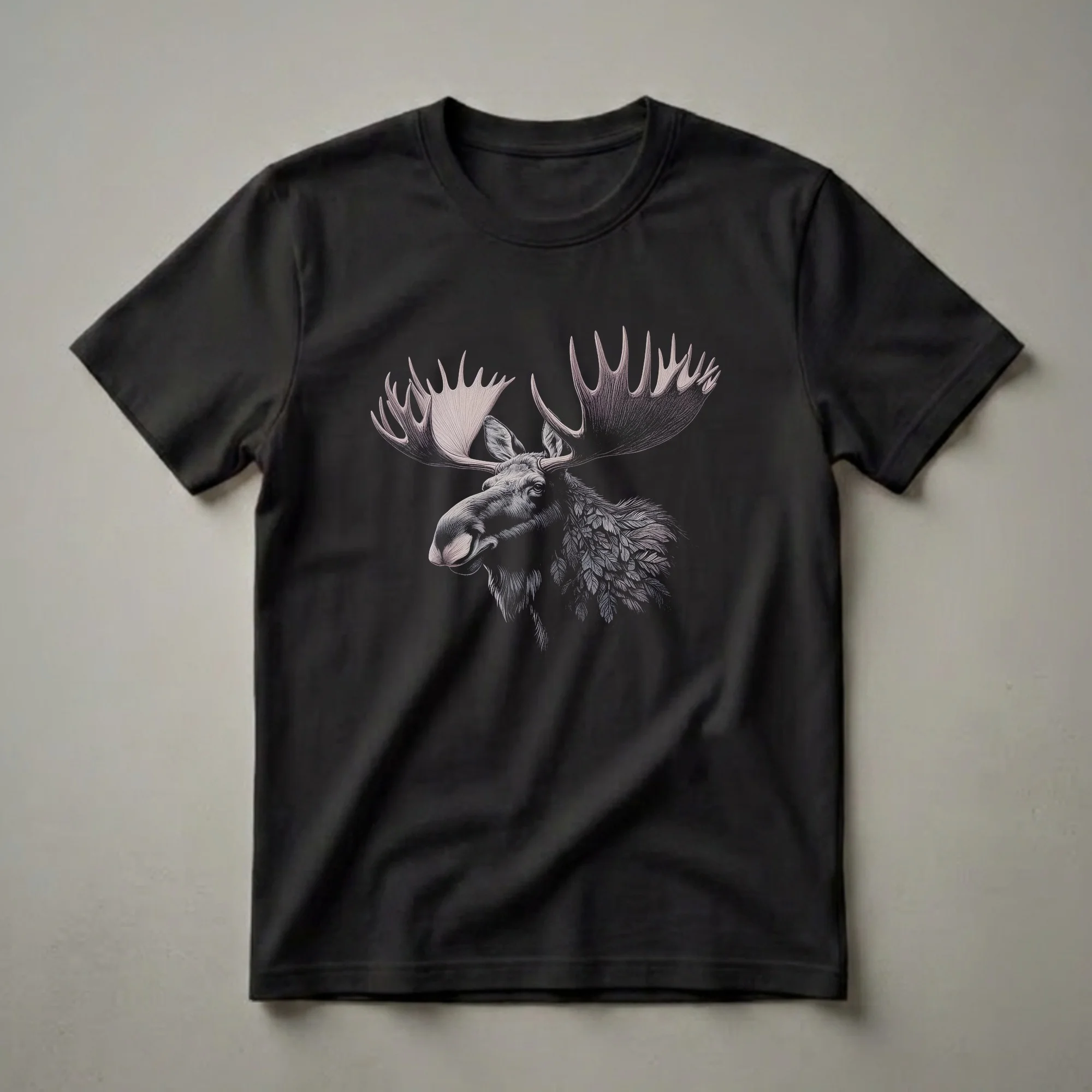 Wildlife enthusiasts who appreciate the majestic presence of North American fauna will reach for this unique moose drawing tee. The artwork features a detailed, monochromatic depiction of a bull moose, its impressive antlers dominating the composition. The artist has rendered the moose's fur with fine lines, giving it a textured, almost etched appearance. Notably, the moose's neck and chest are adorned with a pattern of delicate leaves, blending the animal's natural form with elements of the forest it inhabits. This striking graphic tee is a thoughtful gift for anyone who enjoys hiking, camping, or simply admiring the natural world. Moose are the largest members of the deer family and are typically found in boreal forests and temperate broadleaf and mixed forests of the Northern Hemisphere. This shirt works well for those who want to express their connection to the wilderness. Wear this t-shirt on your next outdoor adventure or casual outing to spark conversations about wildlife and nature.