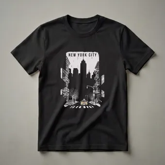 New York City's iconic skyline and bustling streets are captured in this striking graphic t-shirt. The design showcases a classic street view, complete with detailed fire escapes adorning apartment buildings, bare trees lining the sidewalk, and a quintessential yellow taxi crossing a pedestrian-filled crosswalk. In the background, the silhouette of the Manhattan skyline rises, a timeless symbol of urban ambition and architectural marvel. This tee is for anyone who loves the energy and unique character of New York City, whether they are a lifelong resident or a frequent visitor. It makes a thoughtful gift for someone who dreams of visiting the Big Apple or for a New Yorker who cherishes their city. Wear this shirt to explore your own city streets, visit a museum, or simply enjoy a casual day out, evoking the spirit of urban adventure. The graphic style, reminiscent of vintage travel posters, adds a touch of nostalgic charm to this piece of apparel, making it a go-to tee for those who appreciate city life.