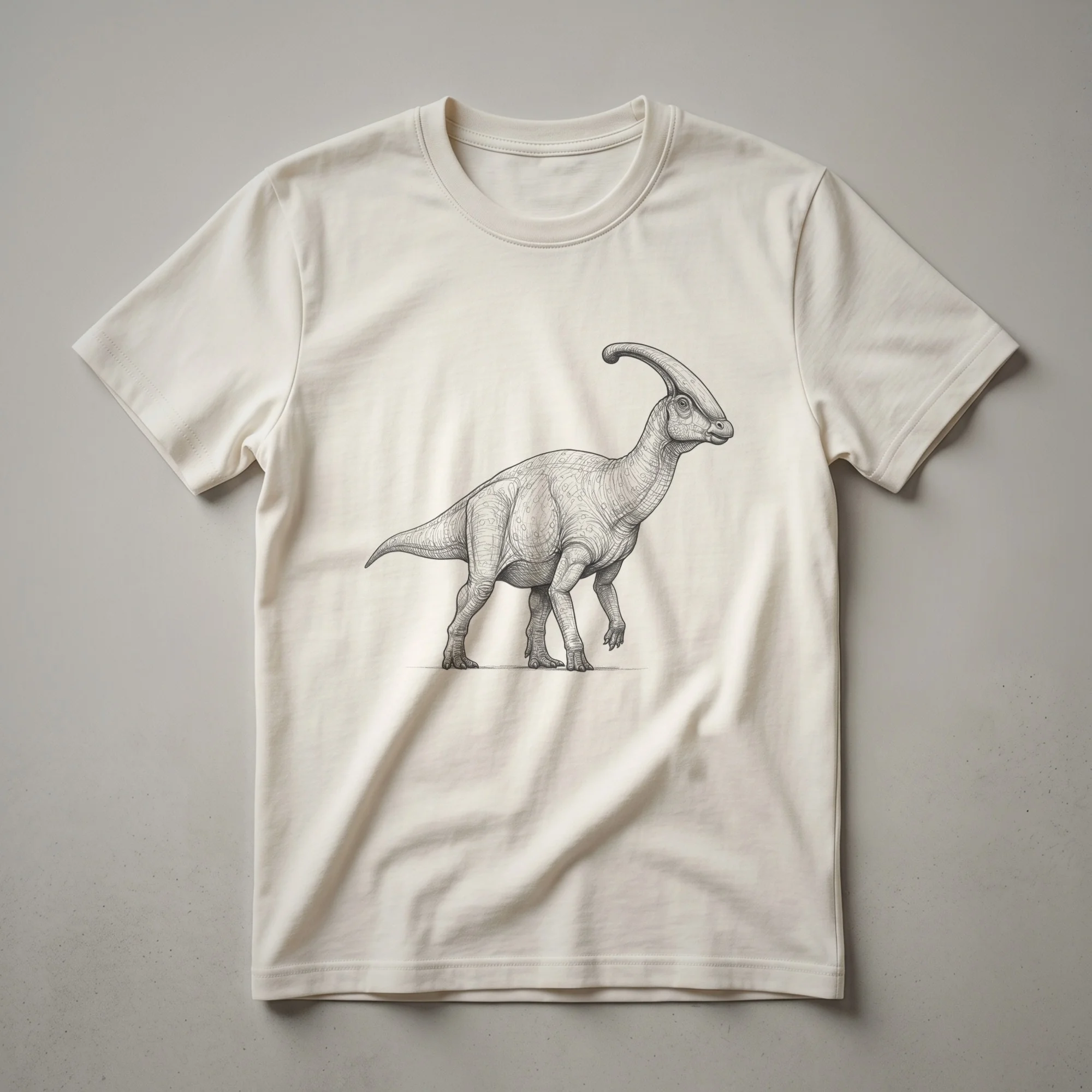 Paleontology enthusiasts and dinosaur aficionados will appreciate this striking graphic tee featuring a detailed vintage line drawing of a Parasaurolophus. This hadrosaurid, known for its distinctive cranial crest, roamed the Late Cretaceous period across North America. The intricate artwork captures the essence of this herbivorous dinosaur, making it a standout piece for any collection. This shirt is a staple for anyone fascinated by the ancient world and its magnificent inhabitants. It makes a thoughtful gift for the dinosaur lover in your life, or a personal treat for yourself. Wear this unique t-shirt to a museum visit, a casual outing, or while discussing your favorite prehistoric facts. It's a conversation starter that celebrates the wonders of natural history and the art of paleontology.