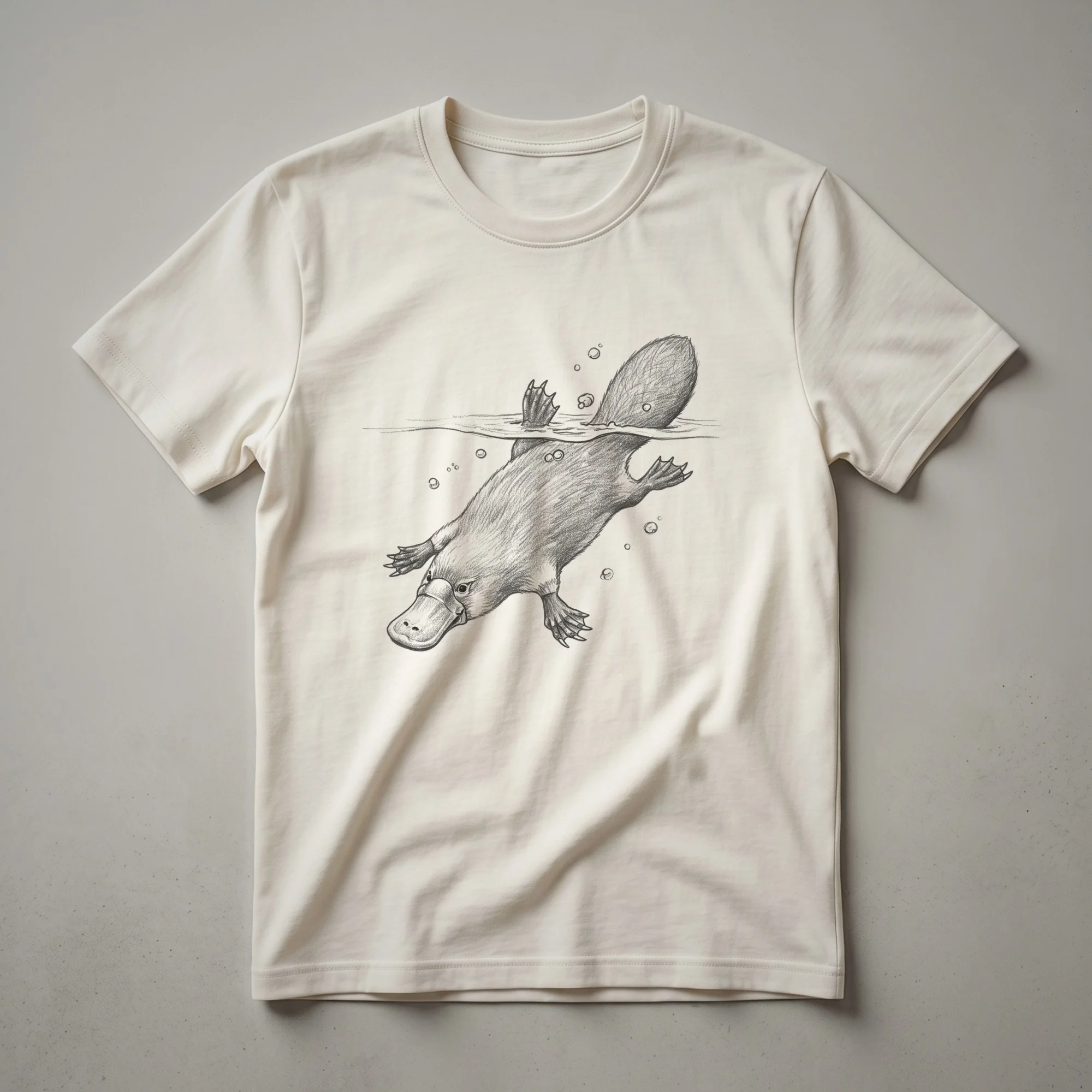 Platypus enthusiasts will appreciate this striking t-shirt featuring a detailed sketch of the unique monotreme swimming underwater. The design captures the platypus's distinctive bill, webbed feet, and beaver-like tail in a classic, vintage artistic style. This mammal, native to eastern Australia, is one of only five extant species of monotremes, mammals that lay eggs instead of giving birth to live young. Its semi-aquatic lifestyle means it spends much of its time foraging in freshwater rivers and lakes for invertebrates. This graphic tee is a fantastic way for any wildlife lover to express their fascination with this extraordinary creature. It makes a thoughtful gift for anyone who admires Australia's unique fauna or enjoys nature-inspired apparel. Wear this shirt to your next nature walk, to a casual outing with friends, or simply while relaxing at home, celebrating the wonders of the natural world. This shirt is a go-to tee for those who appreciate the quirky charm of the platypus.