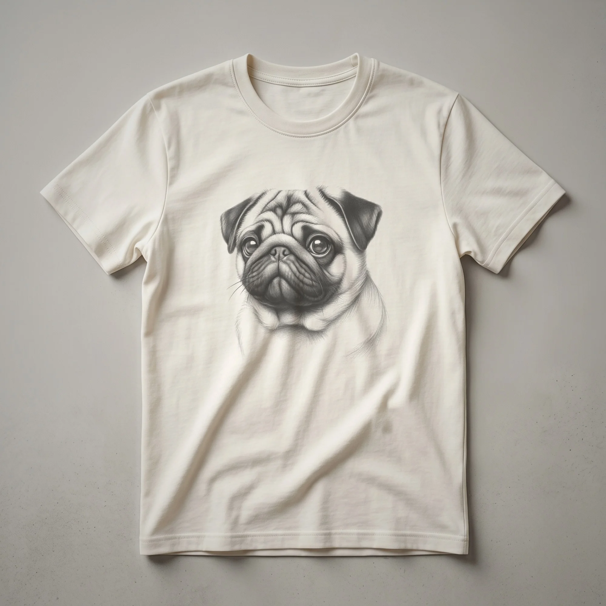 Pug owners who appreciate unique artistic representations of their beloved companions will reach for this striking graphic tee. The design features a detailed, vintage-style sketch of a pug's face, rendered with fine linework that highlights the breed's distinctive wrinkled features and expressive eyes. Pugs, originating from China, are known for their charming, sociable, and sometimes stubborn personalities, making them a favorite among dog lovers worldwide. This shirt captures the essence of the breed with an artistic flair, moving beyond simple cartoon depictions to offer a more sophisticated visual. It's a thoughtful gift for any pug mom, dad, or enthusiast who wants to wear their affection for their four-legged friend. This tee works well for casual outings, dog park visits, or simply relaxing at home with your furry companion. The detailed sketch style gives it a timeless appeal, suitable for anyone who admires the breed's unique charm and character. Celebrate your connection to this endearing breed with this eye-catching apparel.