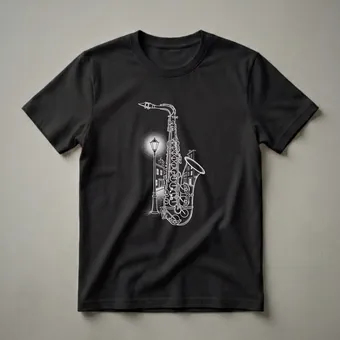 Jazz musicians and lovers of vintage brass instruments will appreciate this striking graphic tee. The design showcases a detailed white line drawing of a saxophone, intricately blended with a nighttime city street scene. A classic lamppost casts a warm glow on cobblestone streets, while silhouetted buildings line the background, evoking the atmosphere of a jazz club district. The saxophone itself is rendered with meticulous detail, highlighting its keys and curves, and appears to merge seamlessly with the urban landscape, suggesting the instrument's place within the heart of the city's music scene. This t-shirt is a thoughtful gift for any saxophonist, jazz enthusiast, or music student who cherishes the soulful sound of brass. It's a staple in the collection for anyone who enjoys a unique artistic representation of their passion. Wear this shirt to a jazz concert, a music lesson, or simply when you want to showcase your love for the saxophone and the vibrant world of jazz music. The saxophone, a member of the woodwind family despite being made of brass, is known for its versatility and its iconic role in genres like jazz, blues, and rock and roll.