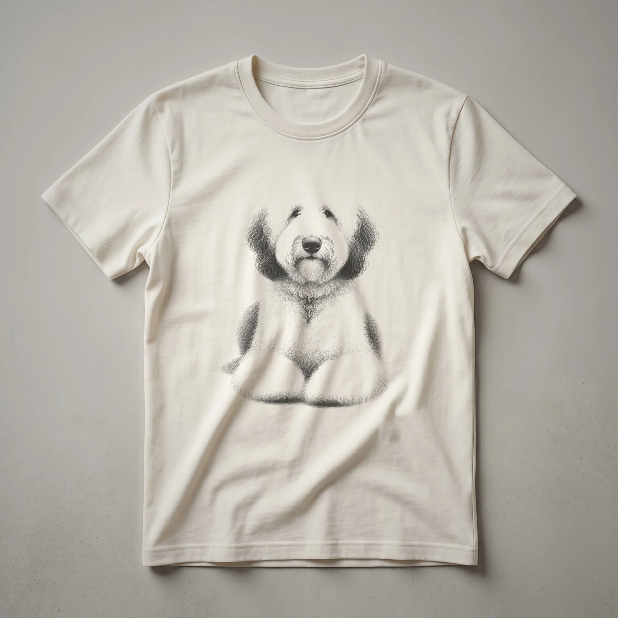 Sheepadoodle owners who appreciate artistic renditions of their beloved companions will reach for this unique t-shirt. The design features a detailed, vintage-style sketch of a Sheepadoodle's face and upper body, rendered in a classic black and white aesthetic. This graphic tee captures the gentle and playful nature often associated with the Sheepadoodle breed, a cross between an Old English Sheepdog and a Poodle. These dogs are known for their intelligence and affectionate personalities, making them wonderful family pets. This shirt works well for casual outings, dog park visits, or simply relaxing at home. It makes a thoughtful gift for any Sheepadoodle mom or dad who cherishes their furry friend. The artistic sketch style offers a sophisticated yet charming way to display affection for this popular dog breed. This t-shirt is a staple for any dog lover's wardrobe, celebrating the unique charm of the Sheepadoodle with a touch of vintage flair.