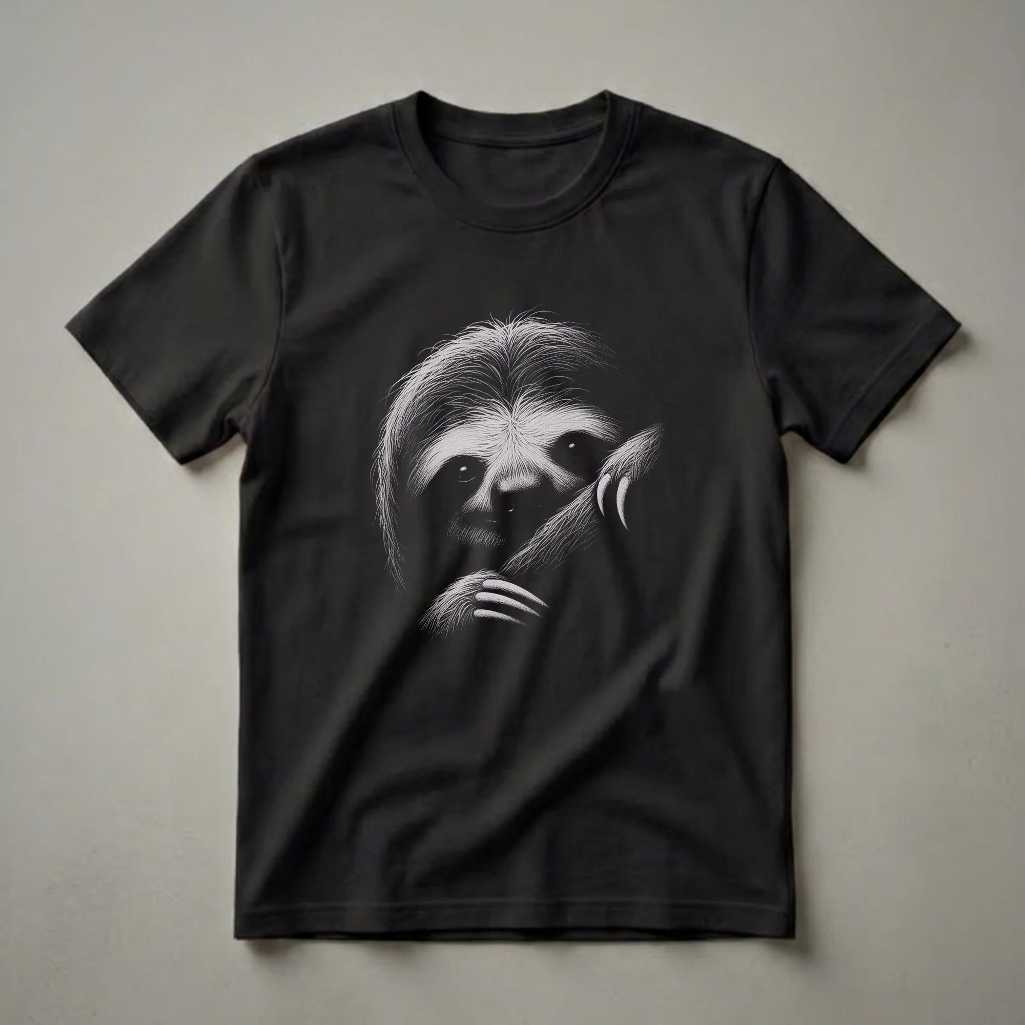 Wildlife enthusiasts who appreciate the slow and steady pace of nature will reach for this unique sloth drawing t-shirt. The artwork features a detailed, scratchboard-style illustration of a sloth's face, rendered in striking white lines against a deep black background. Its large, soulful eyes gaze out, partially obscured by its own fur and a branch it clutches with its long, sharp claws. This artistic depiction captures the gentle, unhurried essence of these fascinating mammals. Sloths are known for their arboreal lifestyle, spending most of their lives hanging upside down in the rainforest canopies of Central and South America. Their incredibly slow metabolism is a key adaptation to their low-energy diet of leaves. This graphic tee is a thoughtful gift for anyone who admires these unique creatures or enjoys nature-inspired apparel. Wear this shirt to your next nature walk, casual outing, or while relaxing at home, celebrating the calm spirit of the sloth.